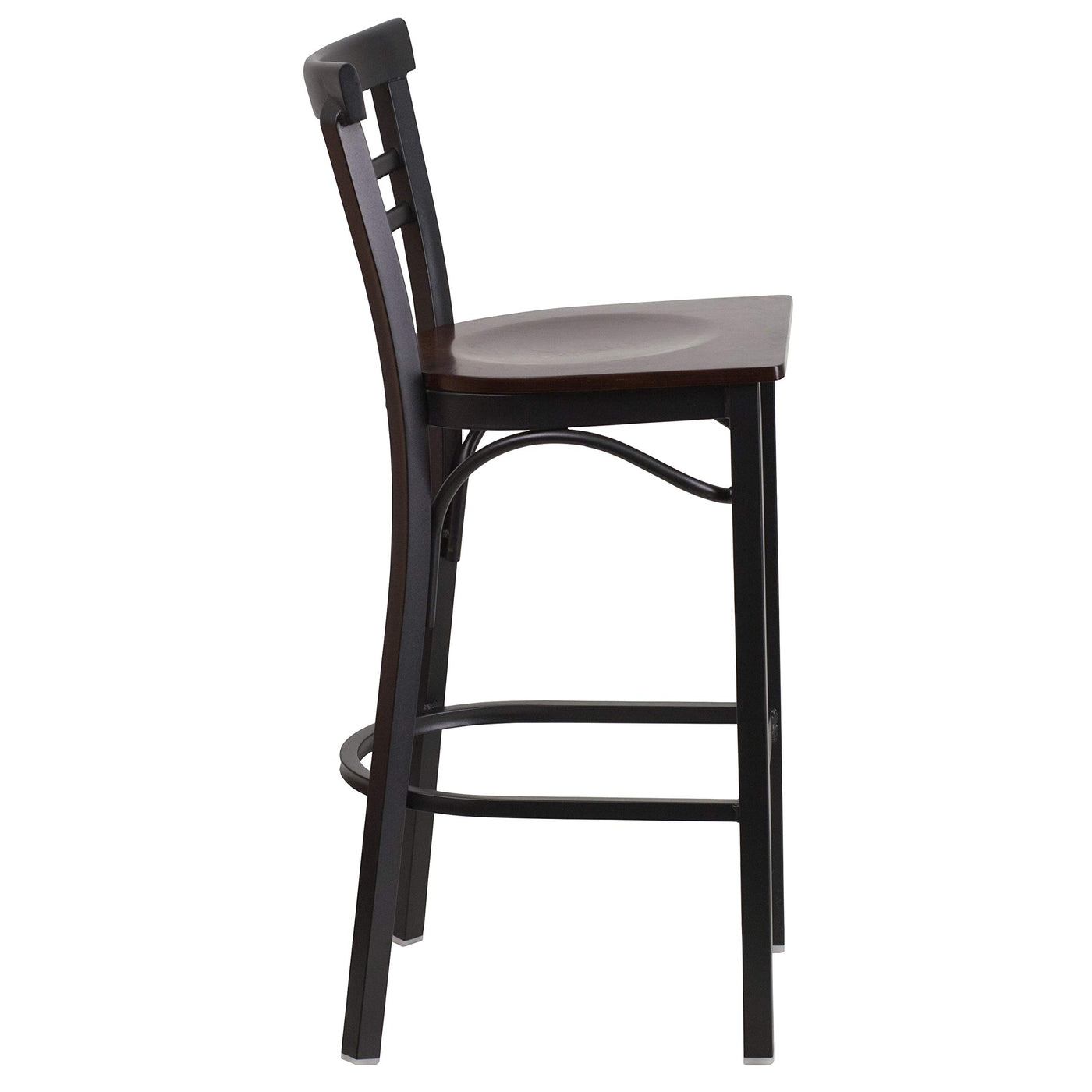 Create a first-rate dining experience by offering your patrons great food, service and attractive furnishings. Metal barstools are a popular choice for furnishing restaurants, pool halls, lounges, bars and other high traffic establishments. This 2-slat ladder back metal restaurant barstool is easy to clean, which is an important aspect for a business.Built to withstand everyday use in the restaurant and hospitality business, these dining stools will also look great in your home. The beautiful walnut wood seat will keep guests comfortable. The frame is stabilized using two welded support bars, which includes a footrest to prevent leg discomfort. The floor glides help protect your floors and ensure smooth gliding. Use this bar height stool in your dining room or home bar to give your decor a fresh look. The simple and lightweight design of this stool is a must have, whether used in the home or your commercial business.
