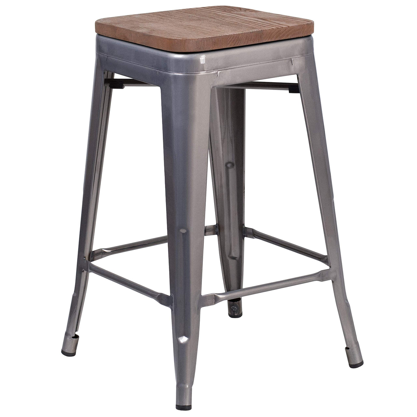 Save on space with this Clear Coated Backless Metal Counter Stool with wood seat. The clean lines and simple design of this square, industrial style stool will look great in your kitchen or inside your bar/restaurant. Designed to stack, this stool is an ideal choice in the restaurant industry. A cross brace underneath the seat adds extra stability and features plastic caps that prevent the finish from scratching when stacked. The lower support brace doubles as a footrest, and floor glides protect your floor by sliding smoothly when moving it. Designed for both commercial and residential use, this counter height stool will provide refreshing rustic feel with its metal and wood features.