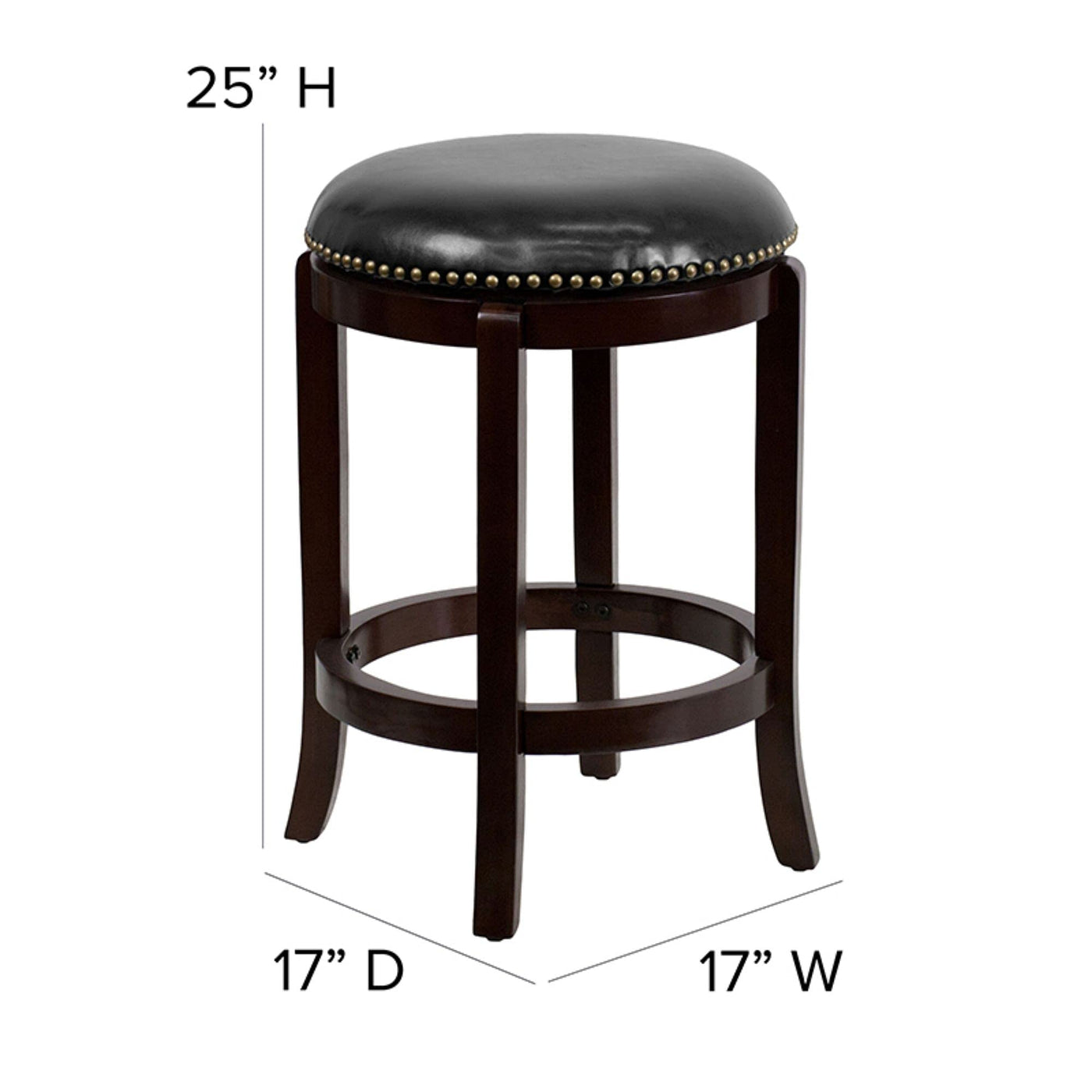 Set a welcoming tone at your kitchen island or bar with this swivel counter stool featuring soft and durable black LeatherSoft upholstery. These traditional stools will look gorgeous around your pool table to give everyone a good view while playing or waiting to take on the winner. This swivel stool is crafted from a durable wooden frame with a cappuccino finish and has floor glides that'll protect your hard surfaced flooring. Clean up spills with a solvent and water-based cleaner such as foam to keep this stool looking great. Backless stools allow full access seating from every angle and provide a clean line of vision when pushed underneath kitchen island overhangs. The circular footrest stabilizes the stool and supports your feet for comfort. Attractively styled with nailhead trimming and bowed legs, this dining counter stool can help warm up the ambiance in your home.