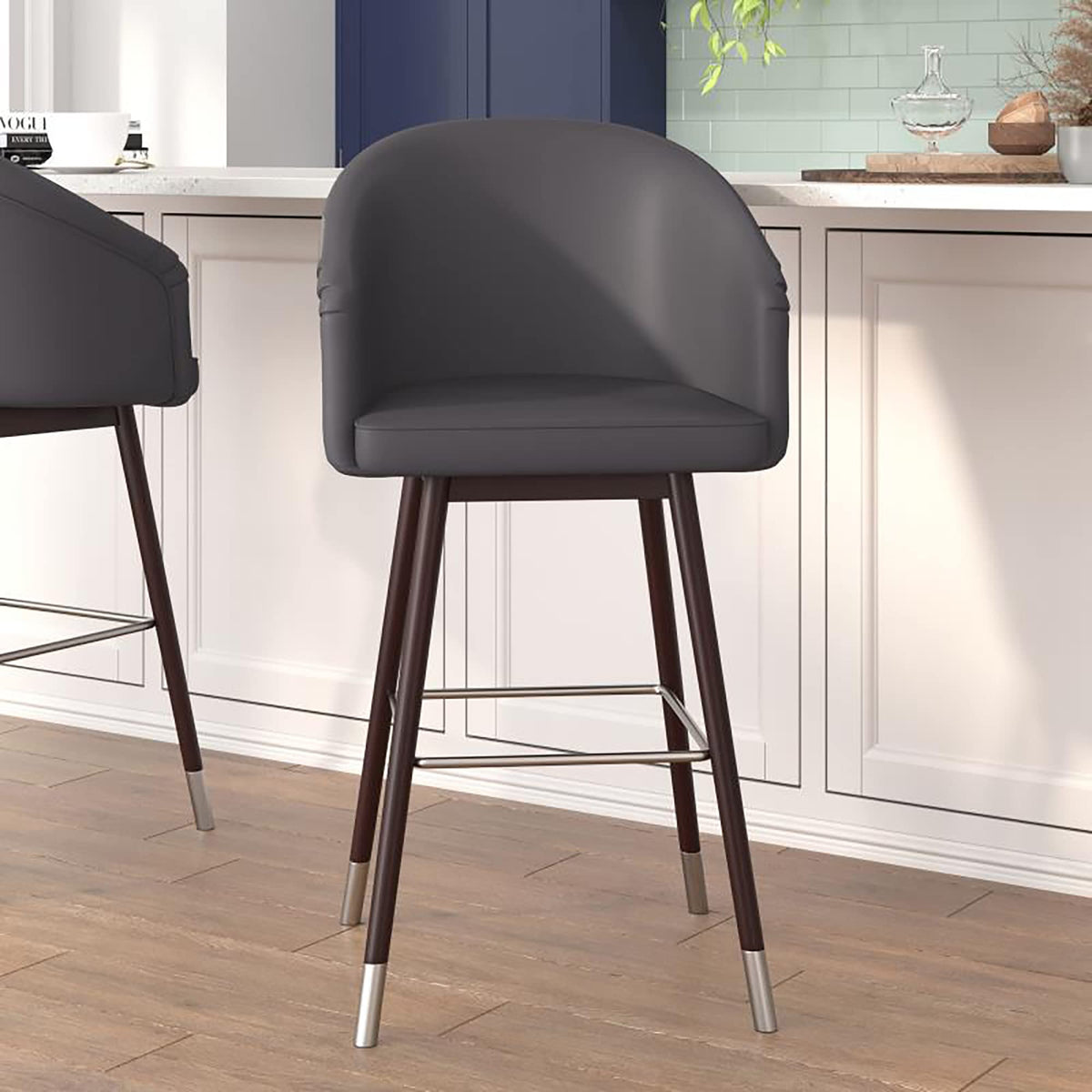 Bring your home or business into the 21st century with the modern trendy style of this set of 2 commercial grade stools available in bar and counter heights. Covered in soft and durable LeatherSoft upholstery and boasting brushed silver accents on the legs and footrest, the minimalist style of this mid-back 30' barstool is sure to be an asset in any decor. The contoured back, integrated arms, and high density foam padding give your guests the ultimate place to relax and unwind. Great style paired with superior strength and durability make this bar stool a must-have for both business and home environments. Solid beechwood legs paired with powder coated steel bracing that doubles as a footrest allow this upholstered stool to hold up to 300 lbs. static weight. Floor protector glides keep your hard flooring surfaces free from damage and assembly takes less than 30 minutes with the included tools and instructions. Wipe with a dry cloth to keep your new bar height chairs looking brand new.
