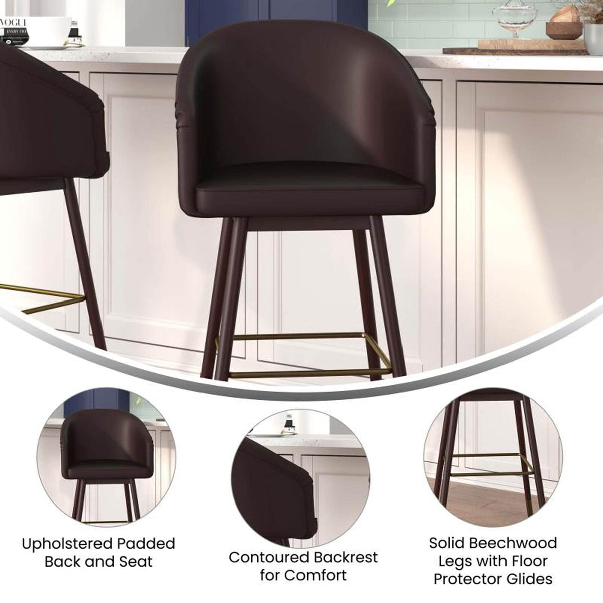 Bring your home or business into the 21st century with the modern trendy style of this commercial grade stool available in bar and counter heights. Covered in soft and durable LeatherSoft upholstery and boasting soft bronze accents on the legs and footrest, the minimalist style of this mid-back 30' barstool is sure to be an asset in any decor. The contoured back, integrated arms, and high density foam padding give your guests the ultimate place to relax and unwind. Great style paired with superior strength and durability make this bar stool a must-have for both business and home environments. Solid beechwood legs paired with powder coated steel bracing that doubles as a footrest allow this upholstered stool to hold up to 300 lbs. static weight. Floor protector glides keep your hard flooring surfaces free from damage and assembly takes less than 30 minutes with the included tools and instructions. Wipe with a dry cloth to keep your new bar height chairs looking brand new.