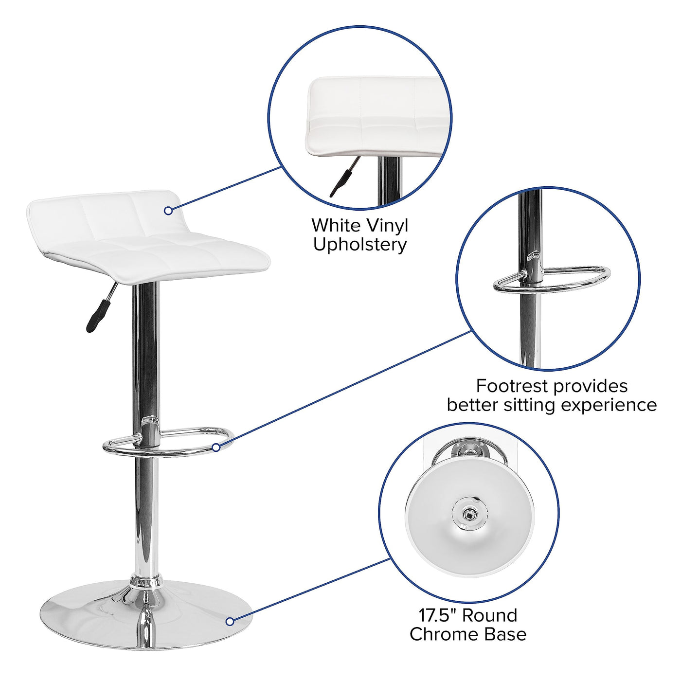 Simplicity and elegance go hand in hand with this white adjustable height barstool with a charming quilted design. The overall design is casual and contemporary which allow it to seamlessly accent any area in the home. The easy to clean vinyl upholstery is perfect when being used on a regular basis. The height adjustable swivel seat adjusts from counter to bar height with the handle located below the seat. The chrome footrest supports your feet while also providing a contemporary chic design. To help protect your floors, the base features an embedded plastic ring.