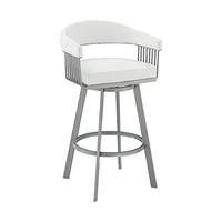 Experience the true meaning of luxury with this 26-inch white faux leather swivel bar stool with silver finish. This stool is a great way to beautify your home without compromising functionality. Featuring a comfortable curved open backrest with stainless steel and faux leather accents, this chair has a unique and contemporary feel. The sides are an open, airy rounded bar design and a footrest provides some additional comfort and stability while sitting. The combination of the soft faux leather seat cushion and backrest mixed with the heavy-duty steel makes this eye-catching design built to last. The stool also comes with a full 360-degree swivel effect so you can enjoy your conversations facing your preferred direction without an uncomfortable feeling. 34' x 22' x 21'