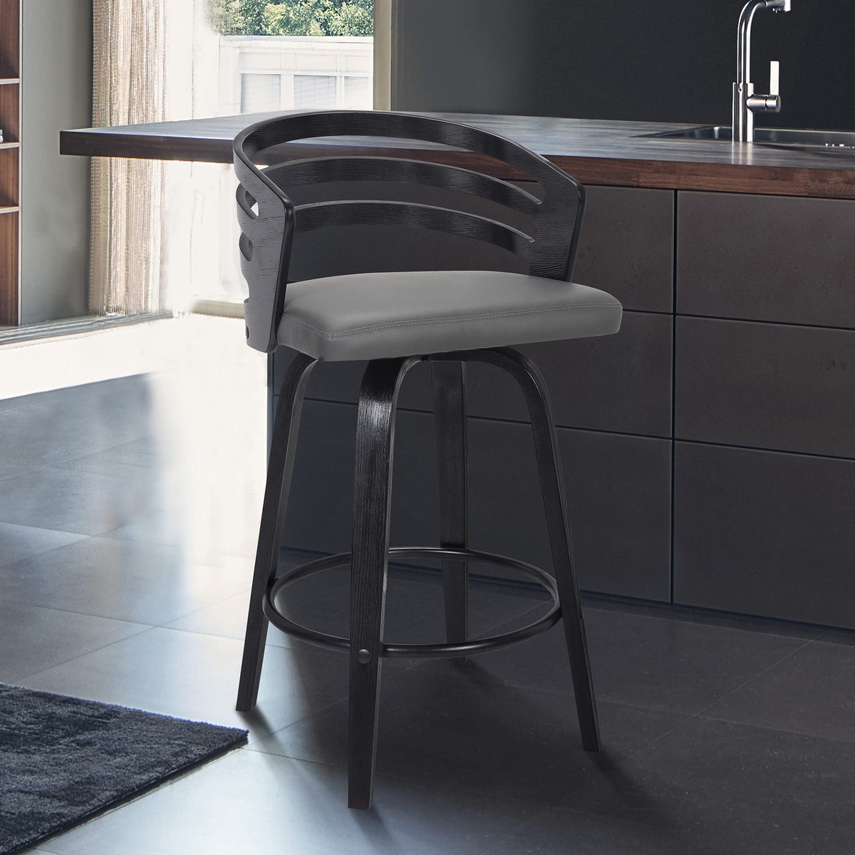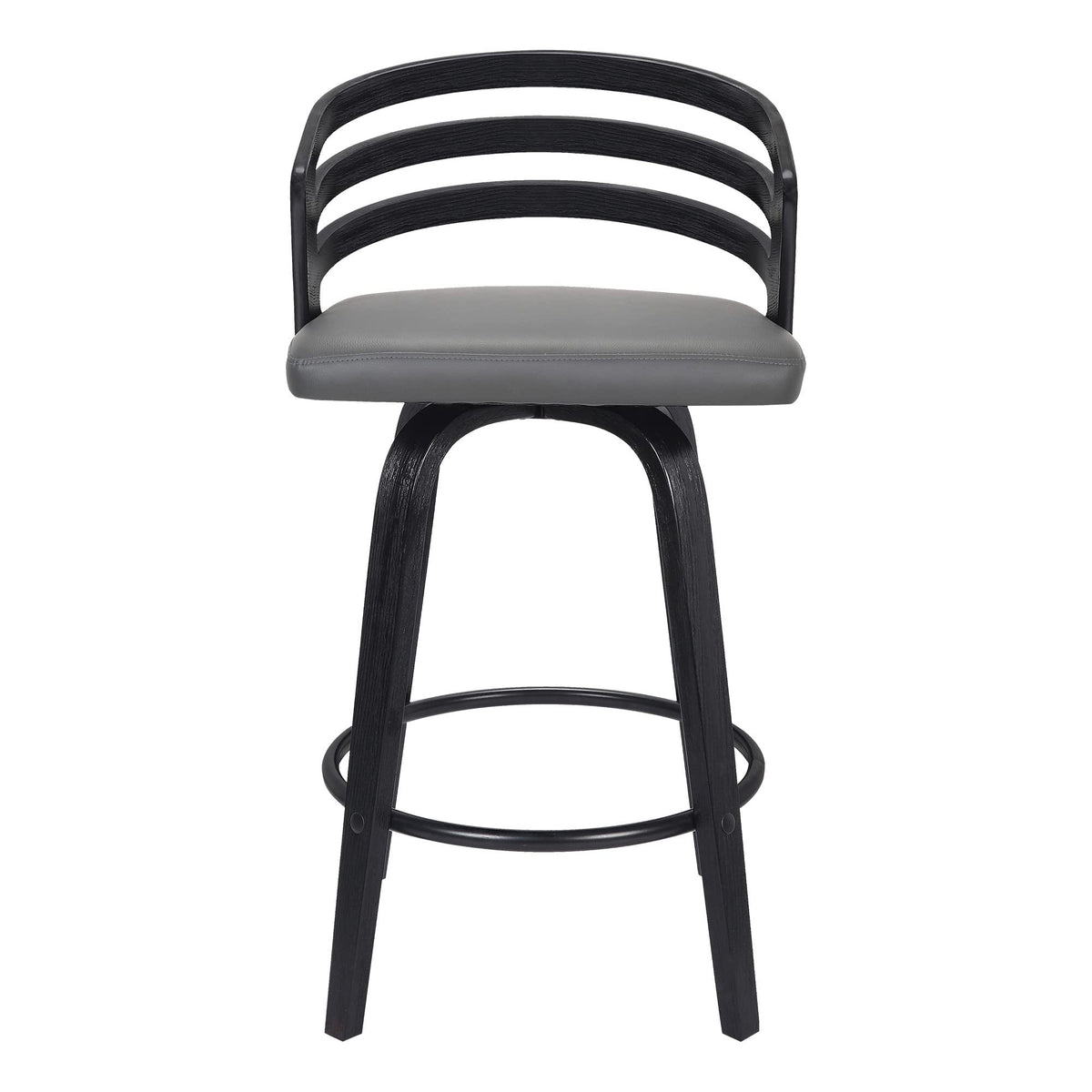 Bring mid-century back to your living space with this timeless modern gray faux leather swivel stool that screams modern, soft, and blends effortlessly with any decor. The seat looks elegant yet cool with its space gray faux leather upholstery and classic black wood for the support and footrest. It has several ergonomic features such as a 360-degree swivel function that allows you to turn in any direction comfortably without moving and a rounded backrest that supports healthy posture and serves as a brilliant design. This stool offers stability like no other with its sturdy 4-legged metal base, promising optimal stability and comfort at all times. The soft, plush seat cushion is made with high-quality foam and wrapped in luxurious gray faux leather upholstery that is stylish and extra durable, allowing for easy cleaning. This stunning modern piece of art is perfect for any kitchen island, countertop or bar at home and will never fail to be the center of attraction. 39 x 19 x 19.5 inches