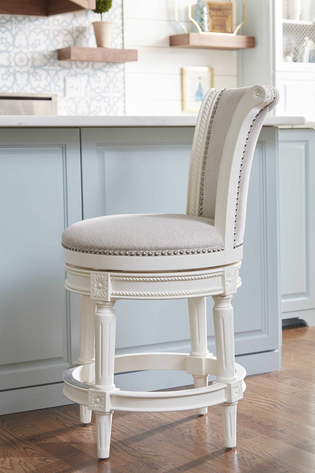 This designer Modern Farmhouse White Counter Height Bar Stool is a top notch addition for those with discerning taste In a gorgeous whitewash finish this swivel bar stool has soft gorgeous gray linen upholstery hand applied nail head trim and beautifully detailed trim work Not only is this stool good looking but it is comfortable too as the high back styling helps to keep your posture in check Made of real hard wood this stool is classic in design made to last and made to elevate the room A new design of our classic barstool this barstool comes ready to assemble with a full back for increased support and comfort Same classic design partnered with our new high back option this backed barstool is a perfect fit for your home 235 x 2025 x 3893 Specifications. Height 39 in. Width 235 in. Depth 2025 in. Material Hardwood Linen Upholstery Foam Batting. Color Alabaster White. Country of Origin United States