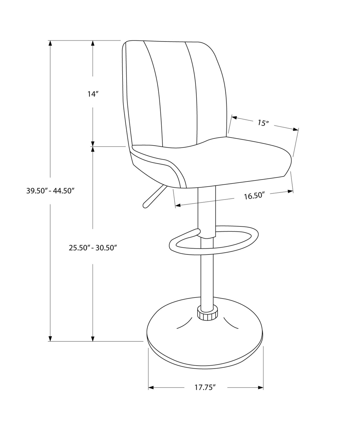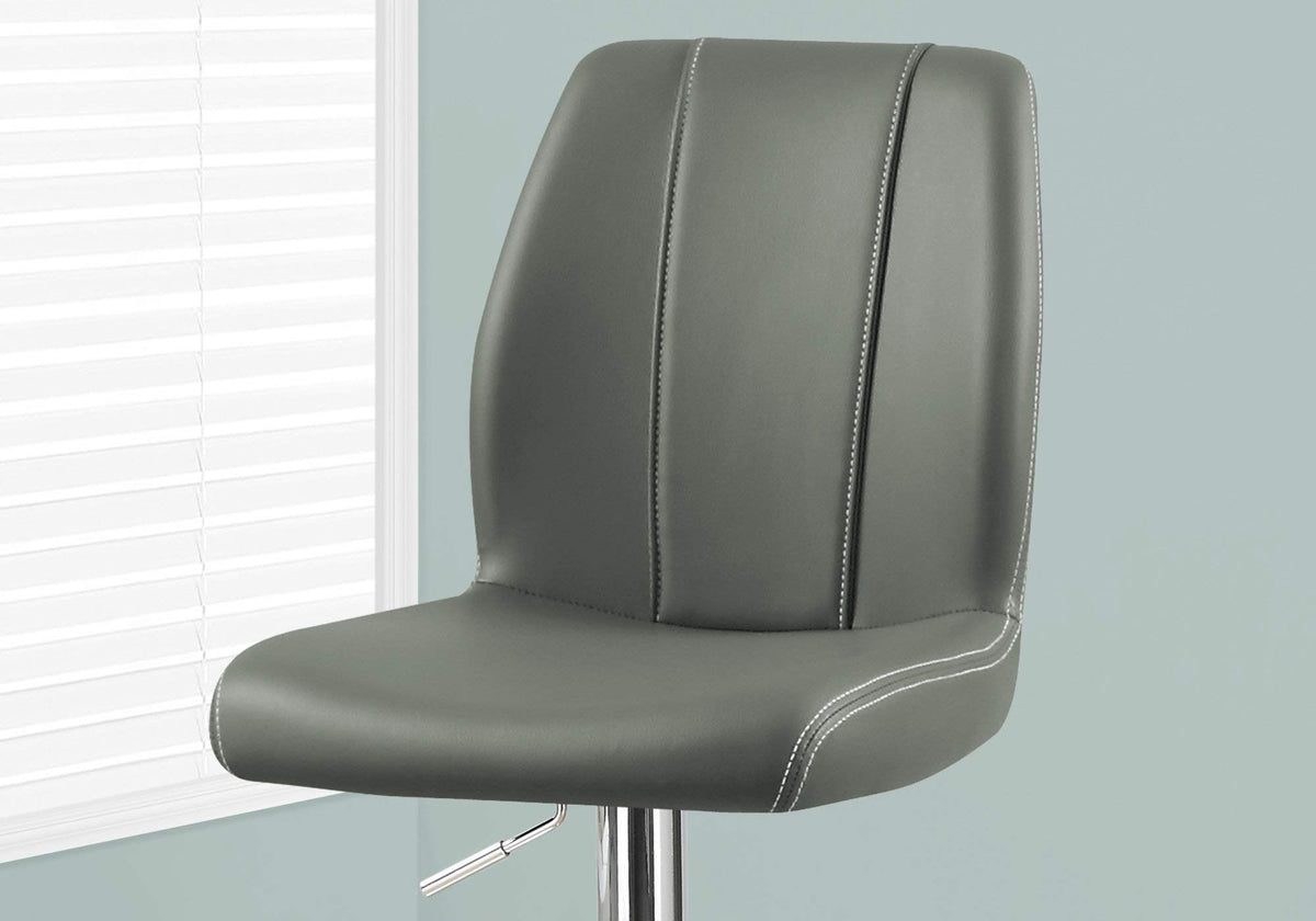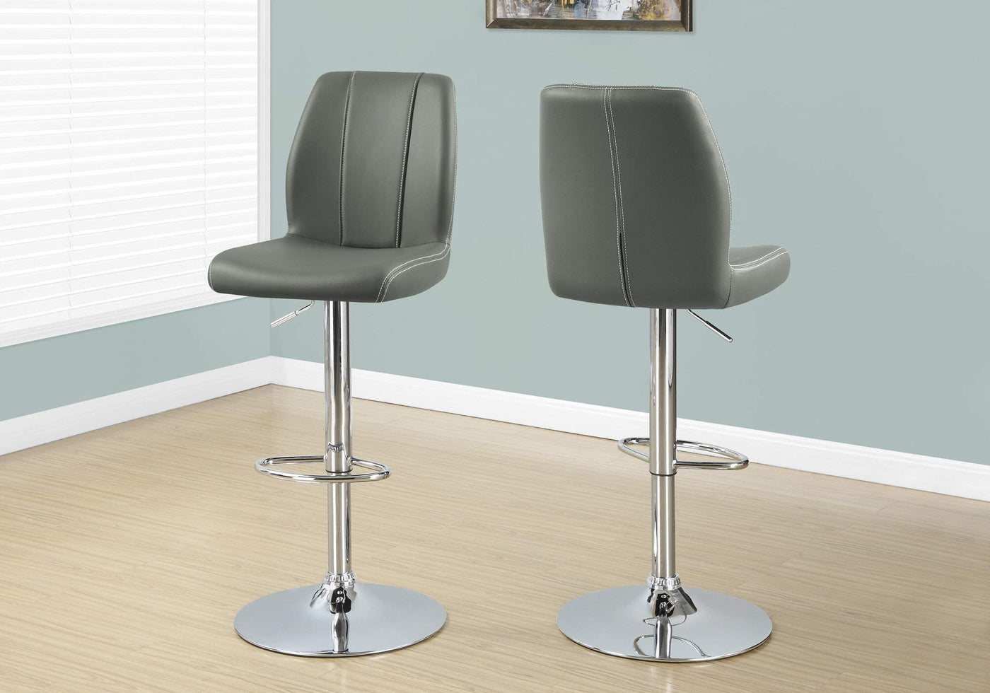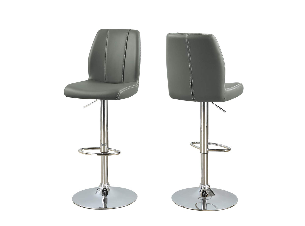 Perfect for your kitchen, breakfast bar or game room, this contemporary 2pc bar stool set will be a stylish addition to your home. Generously padded and upholstered in a grey leather look material, these stools are as comfortable as they are visually appealing. The pedestal base with shiny chrome finish features a perfectly positioned footrest for added comfort, while the full-swivel mechanism and easy-to-use hydraulic lift system will take you to new heights!