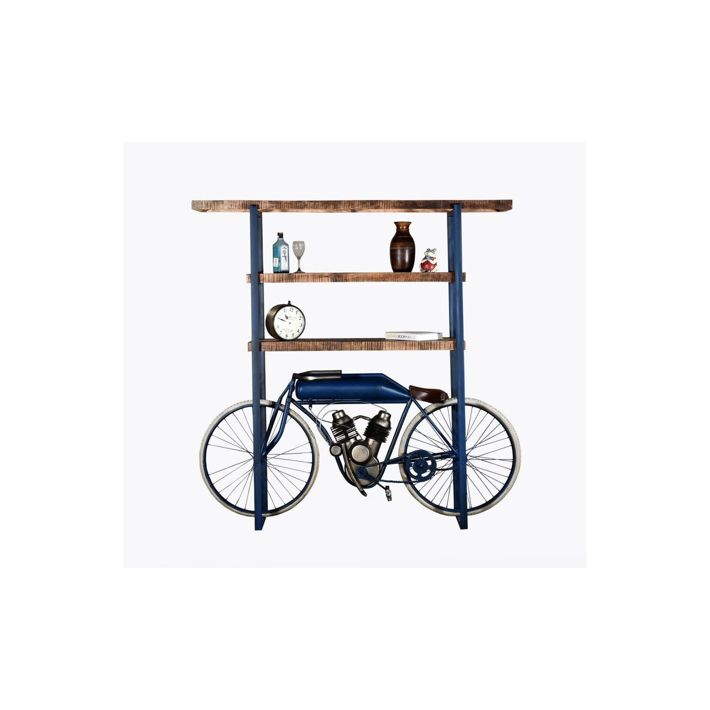 This cycle bookshelf turns your bar area into a center of attraction. Made of wood and metal in blue color, this piece provides a durable and classic way to serve wine. It features sufficient area and components for storage and display; add it to your home for an update.