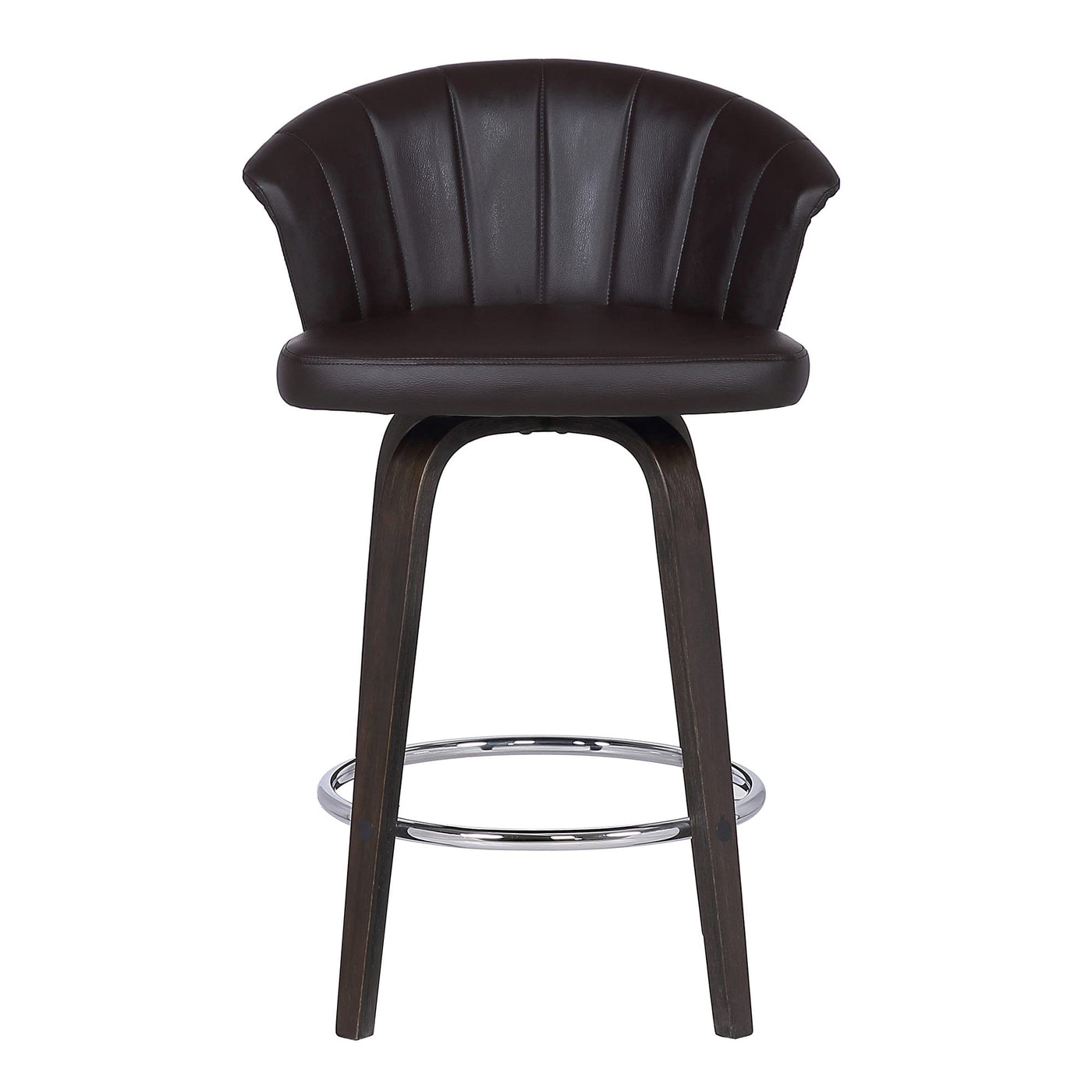Add a mid-century flair to your space with this Dark Brown Faux Leather and Rustic Wood Back Swivel Bar Stool. A soft a comfy brown faux leather seat is highlighted by dark brown finish curved legs and framed with a rustic dark brown grainy finish across the back to give this chair a unique and special look. The inside of the back rest features rich looking channel stitching and the the chair has a swivel function for convenience and mobility. Enjoy optimal functionality and good looks with this great stool. 35' x 22' x 20'