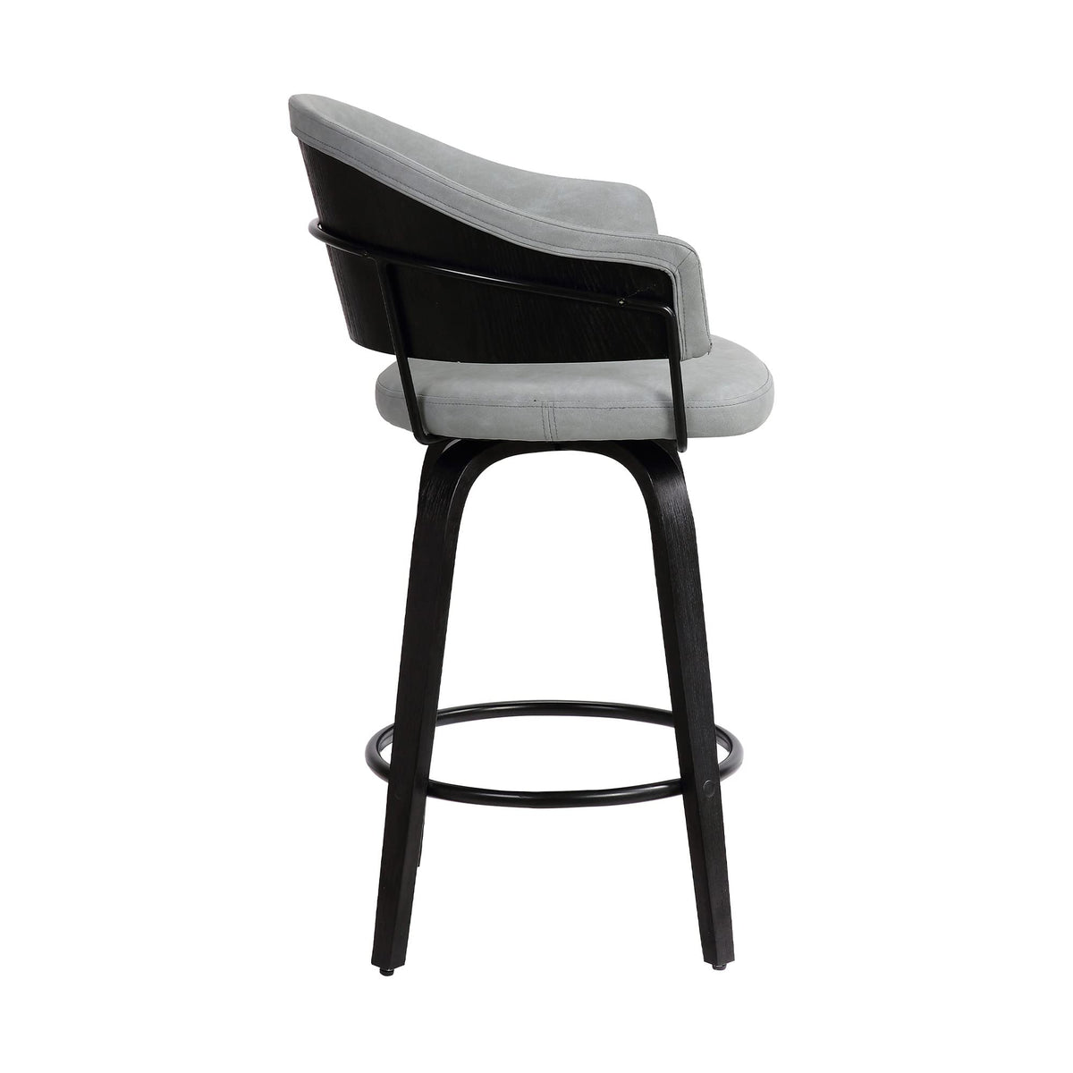 Add a modern and slightly edgy vibe to your space with this 26' Dark Grey Faux Leather Black Wood Swivel Bar Stool. The stool was designed with both aesthetic pleasure and comfort in mind, which are exactly what you'll enjoy when you invest in this bar stool. The stool features a plush seat that is covered in luxury faux leather with a swivel function that lets you turn to any direction you want with ease. The black coated wood frame and sleek straight legged design is exactly what's needed to create the touch of class your room needs. The stool also features a beautiful black steel footrest that gives added comfort and leg support. Casually elegant and contemporary in style, this stool ticks off all the modern bells and whistles. 36.75' x 21.75' x 20.75'