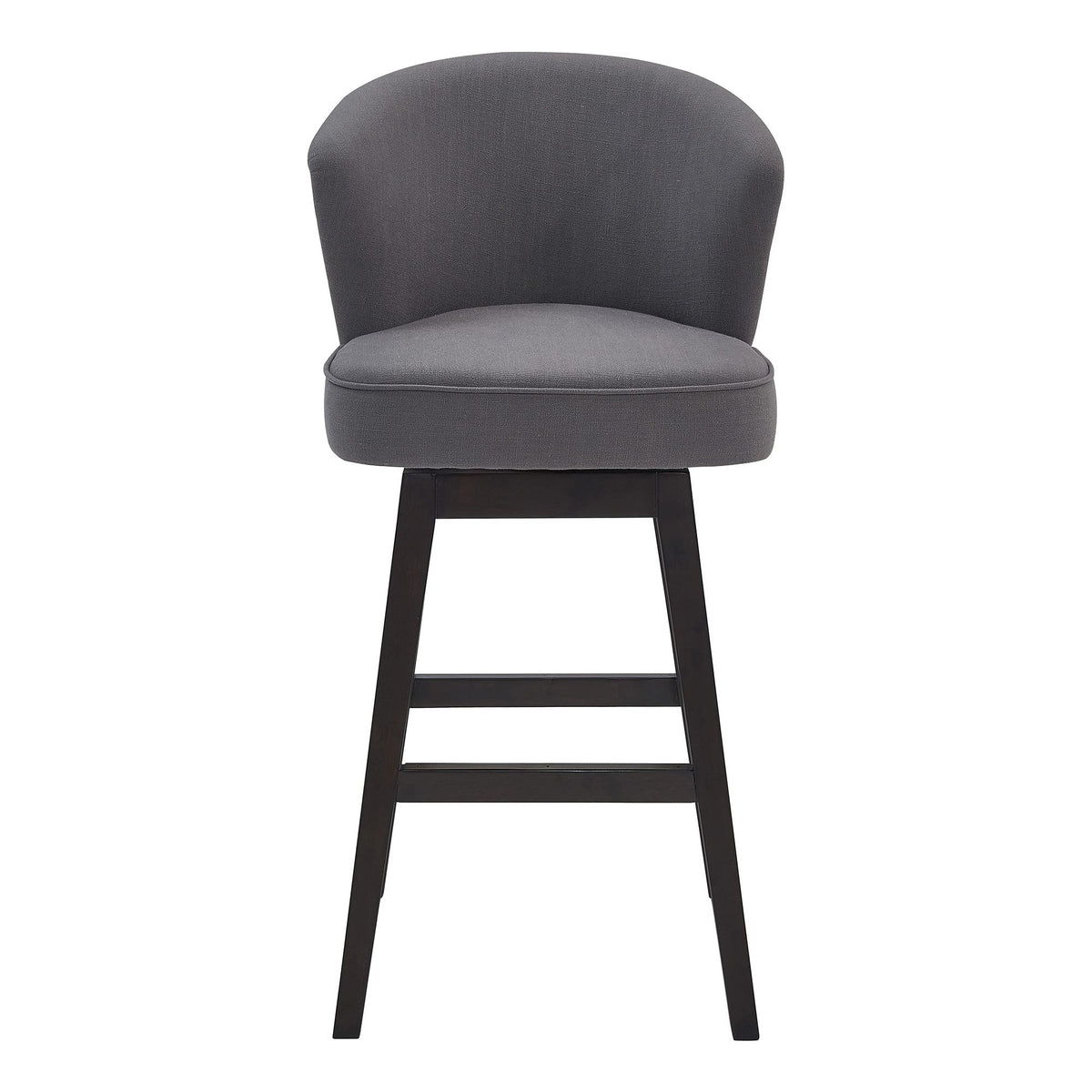 Every design marks an important moment in history and this 26 Grey Espresso Wood Fabric Swivel Bar Stool is your chance to be part of one. Its retro modern style is well accented by the vertical channel stitching across the backside of the backrest. The highdensity foam cushion is beautifully wrapped in a plush fabric upholstery that is durable enough to last for many years. You can also enjoy the full mobility provided by the stools 360degree swivel function while you place your feet on the convenient footrest featured on the wooden base. Features. 26 in. Grey Espresso Wood Fabric Swivel Bar Stool. Features a 360degree swivel seat function that allows the user a wide range of mobility. High quality and fashionable Counter Height Bar Stool. Seat Height is a convenient 26.5 from the groundSpecifications. Color Gray. Size 26 in.. Seat Style Round. Number of Stools Included 1. Seat Color Gray. Frame Material Solid Wood. Seat Material Fabric. Seat Back Type Full back. Seat Height Floor to Seat 26.5. Seat Width Side to Side 21. Seat Depth Front to Back 17. Weight Capacitylbs 250. Base Color Espresso. Material Wood, Foam, Fabric, Metal Turnplate/Kickplate. Dimension 39.5 x 22.5 x 23. Weight 27 lbs