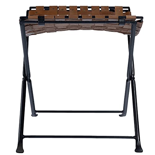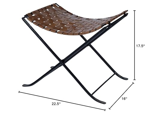 The simple but comfortable woven brown leather stool is a stool designed to blend in with any type of decor you have in your home. The base is made of iron and has been painted black. The legs are crisscrossed and the structure has been developed in a way that you can fold it and store it when you don't need the stool. The seat is made of high-quality brown leather woven in a patchwork design on the iron base, making it flexible and conforming to the shape of your body to provide you with maximum comfort. The edges are finished with a nailhead edge which adds to the quality and uniqueness of this stool. Measurements are 17.5 x 22.5 x 16 inches.