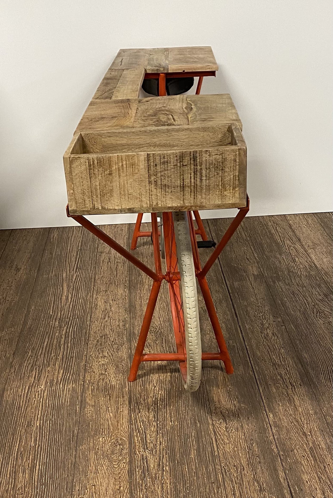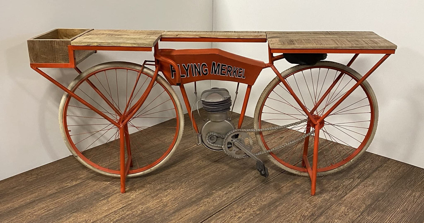 Evoke the early 1900s with this unique Orange Flying Merkel Motorcyle bar cart. The rustic natural grain mango wood table provides plenty of space for display and serving. There is a special side box for towels and additional supplies. Entertain, serve and display in funky style with this super cool vintage orange cart. 34'H x 72'W x 16.5'D