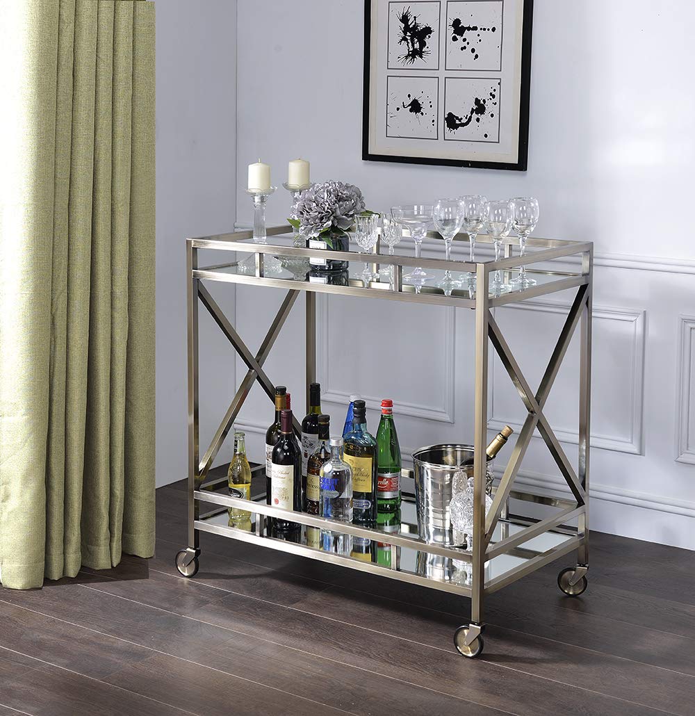 This serving cart stands at the extreme of sophistication and with its fashionable platforms, meals can better be served. Its shimmering antique gold frame highlight beautifully the whole design to give it an inspiring profile. This masterpiece features four elegant caster wheels and grips for easy mobility. The serving cart comes with two mirrored shelves that provide ample space for trays, plates and other serving details. ' Weight capacity: 20Lbs - Serving cart - Storage: open compartment - Mirrored top & shelf: 5mm - Metal frame: antique gold - Caster wheels - Top & shelf: 5mm mirror & 3mm ply