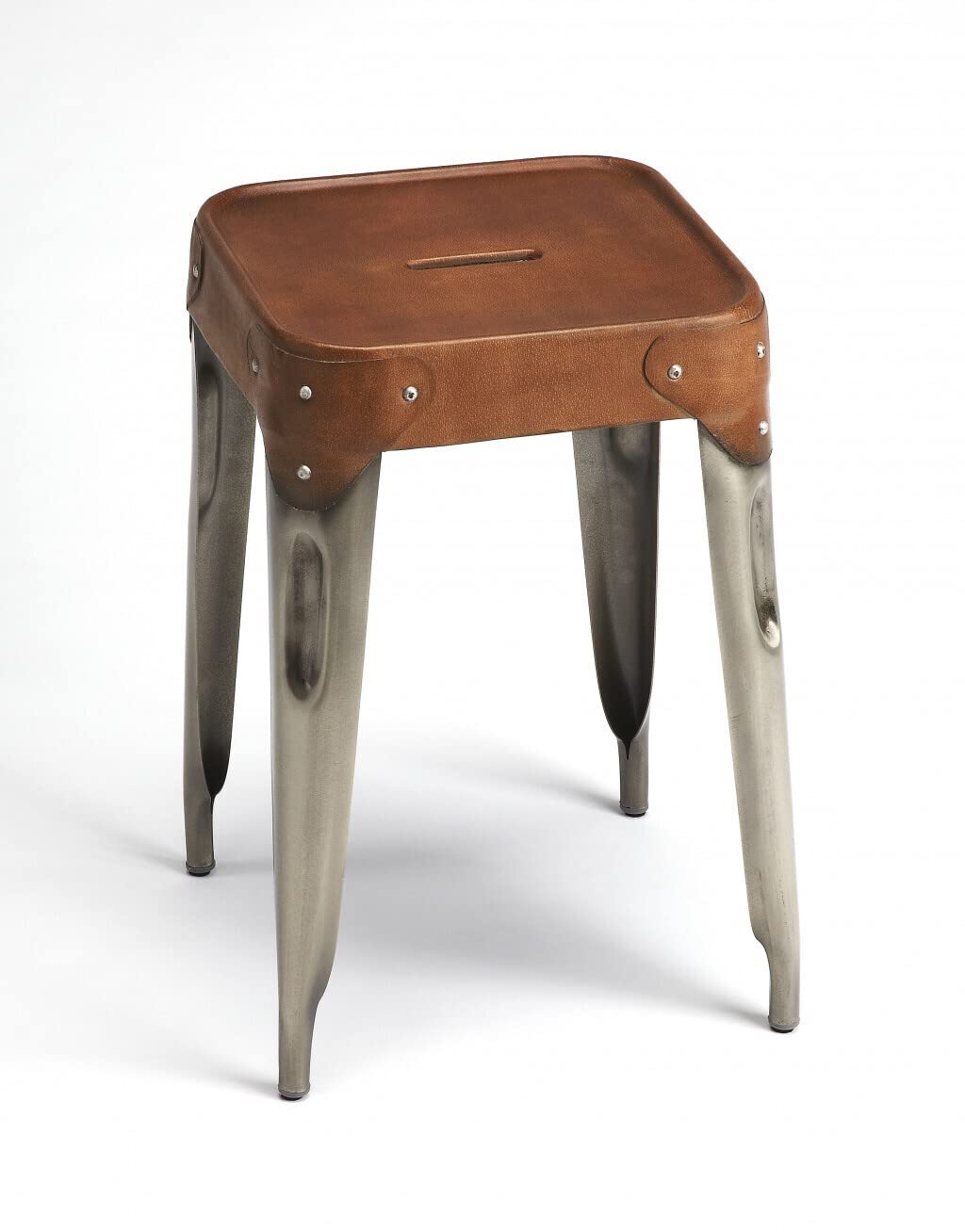 Rustic in essence this Brown Leather Counter Stool has a hint of style and practicality. The genuine brown leather seating with metal hinged corners feels almost like a saddle. Don't be fooled by its decreasingly narrow legs, they provide ample support and stability. 18' x 12.5' x 12.5'