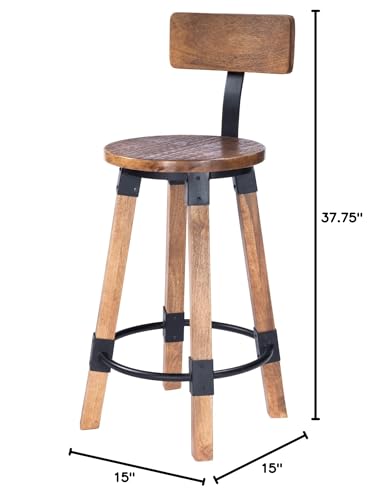 Industrial and chic in character the Sturdy Wood and Metal Counter Stool certainly adds style to your dull space. The textured wood can be easily distinguished from the black metal support. Combined with four strong legs, a circular foot support and a backrest, it ensures maximum comfort. Features. Mango wood, iron black metal finish. Transitional versatile design style. Comfortable and unique. Enhance your space with this decorative seatingSpecifications. Color Natural Wood. Finish Industrial Chic. Seat Color Brown. Material Wood. Style Transitional. Frame Material Iron. Seat Material Solid Wood. Shape Round. Seat Height 28 in.. Seat Width 15 in.. Seat Depth 15 in.. Country of Origin India. Weight 32 lbs