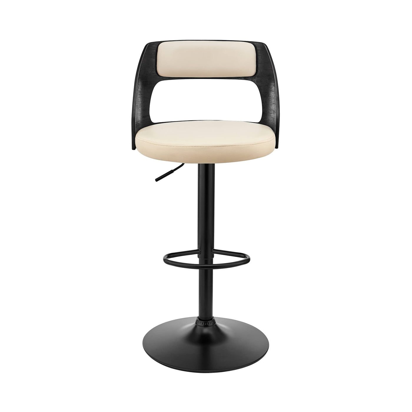 Increase your seating experience at home with this cream upholstered adjustable swivel bar stool that will change the life of your black base that will outshine all other details in the room. Showcasing sophistication and grace with its simplistic design and cream-toned faux leather and black wood frame, this stool is the perfect addition to any home or apartment. It has an ergonomic 360-degree swivel function with black wooden footrest that allows you to turn to any direction comfortably without moving. The stool also has an adjustable height feature with seamless lifting mechanism to adjust to the perfect height until you feel super comfortable, safe and satisfied. The seat is super plush and padded with high-density foam to make sure you feel incredibly comfortable and comfortable while sitting. Bring home this stunning adjustable bar stool to decorate your living room, bar, office or patio in an instant. 44x19x19
