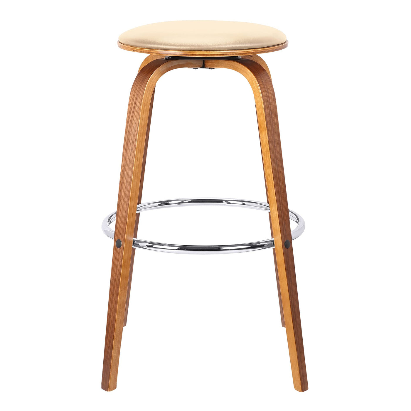 Get that mid-century English pub look in your living room with this modern backless faux leather swivel stool in cream. The dated design along with the vintage colors bring a flourish of a retro aesthetic tailored to fit your style. The backless stool swivels 360 degrees to make a fun addition to your living room when entertaining guests. Made with fine faux leather upholstery and metal base, the chair is minimalist without being boring. The chair base in a walnut wood finish is combined with a cream-toned faux leather for a luxurious look with an old world style. The simplicity of the stool puts a bold influence on any room that is designed with a modern or traditional aesthetic. 25 x 17 x 17 inches