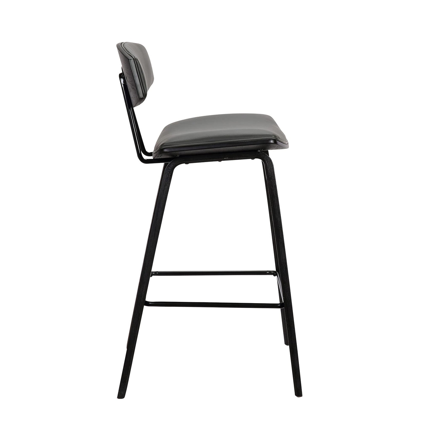 Adorn your living room table or kitchen island with the stylish exterior of this mid-century modern gray faux leather bar stool. The perfect piece of modern furniture with a look of sophistication, this stool provides as much functionality as style. Constructed from a metal, poplar, and faux leather, the stool is a picture of stability that will last you through the years. The dark gray faux leather padded seat and back with a black finished wood frame accentuates a bold yet elegant visual appeal. The cushion is filled with a high-density foam that provides relaxation and the height of the stool can be taken from 25.5 to 28.5 inches for your comfort. The metal base of the stool gives it a modern vibe, while the shape brings a mid-century aesthetic to design a piece of furniture as transitional as the times. 38x16x19