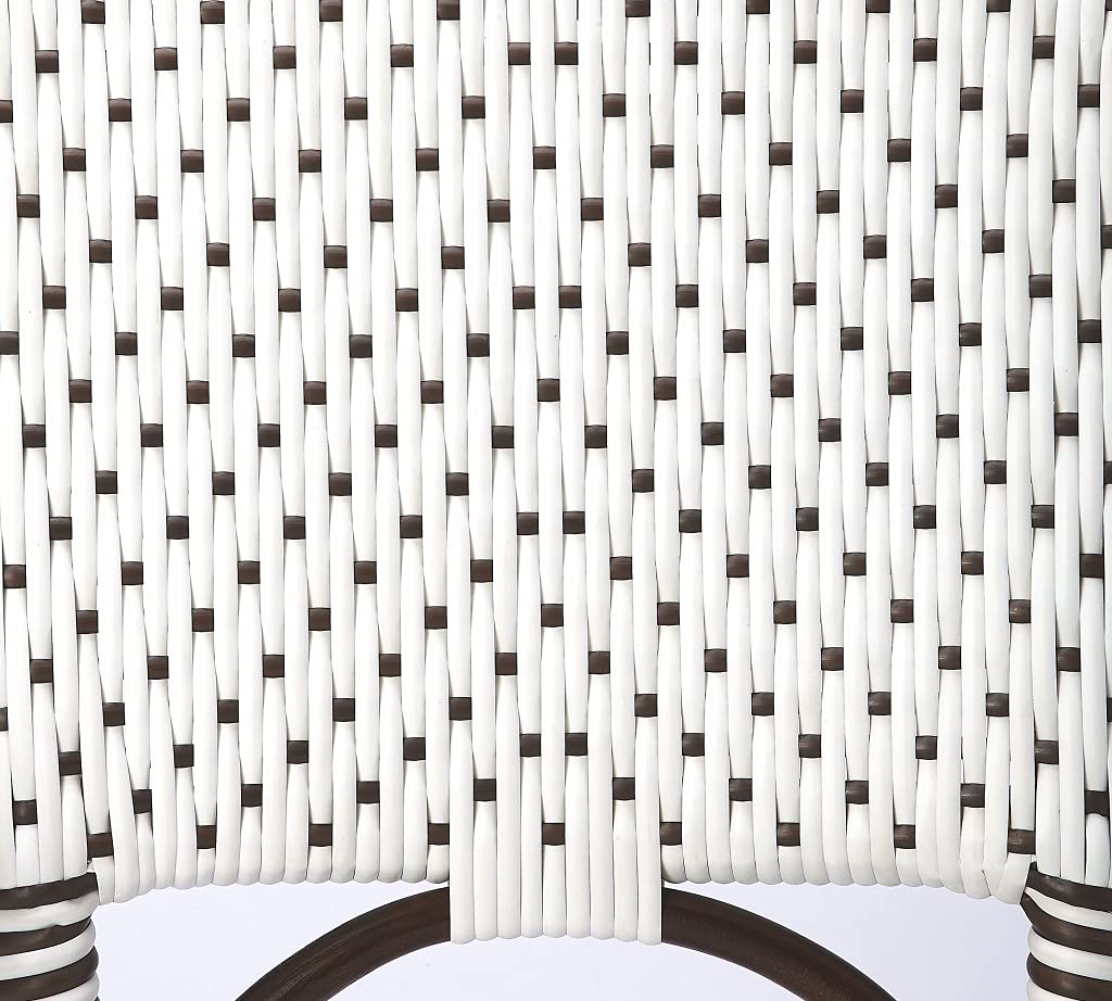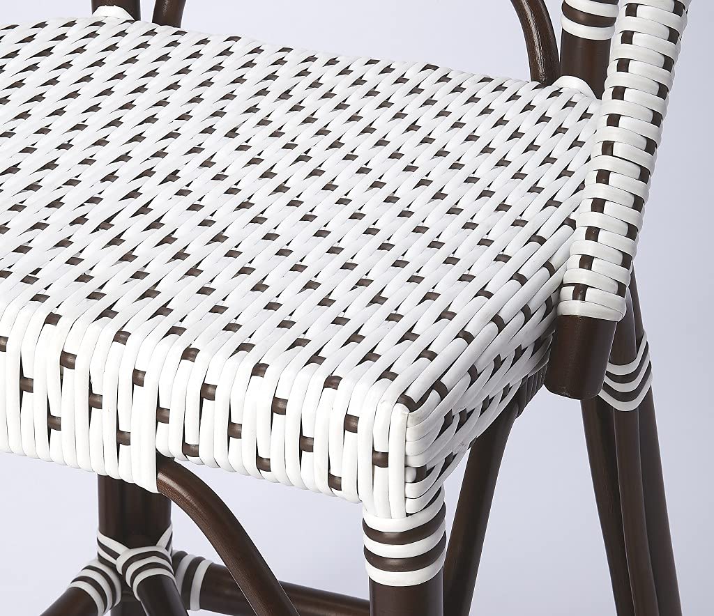 Reminiscent of a Parisian cafe, the white and chocolate rattan stool is practically a tower of radiant beauty. With a touch of simplicity and a touch of contemporary, this woven polyester vision is perfection in design. The seat woven pattern and armrest woven pattern, along with the knotted beams, encapsulate this model. Classic or modern, this stool complements almost any setting from house to barn. Its strong rattan legs have been intricately carved to offer durability and support. 41.25 x 17 x 18.5 inches.