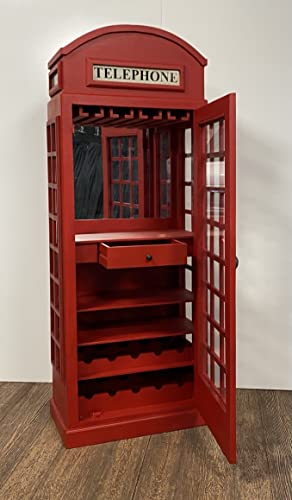 super cool accent piece for your space that also has practical storage and entertaining capabilities. This vintage red wooden telephone cabinet is a full-size replica of an antique telephone booth that has plenty of useful storage and display space inside. A double wine rack at the bottom holds 10 bottles, while the slots at the top of the cabinet hold approximately 8 wine glasses for your drinking pleasure. There are two shelves for storage, a single drawer to hold those coasters and bottle openers, and a mirrored back for storage. An interesting and unique way to store and serve your wine and spirits, this phone booth cabinet will be a big hit. 79'H x 30.5'W x 16.5'D