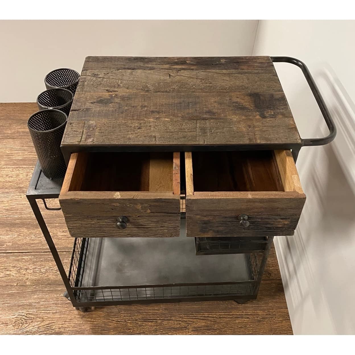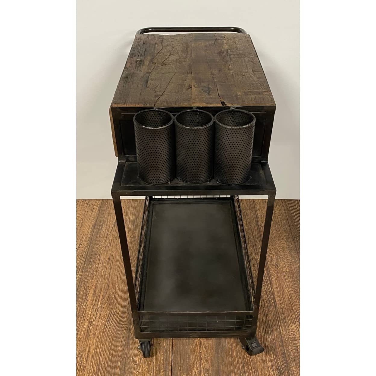 In the kitchen, dining, or lounge area, this Rolling Rustic Black and Natural Bar Cart is a unique and fashionable way to serve, store, and entertain. The rustic wood tabletop and two pull out drawers give you fabulous storage and serving opportunitites. There are 3 metal holders on the top for bottles of wine and a shelving opportunity on the bottom, all in a rustic black matte metal and wire finish. The handcrafted look of this piece makes it special and the wheels make it easily mobile if desired. 37' H x 19' W x 33' D