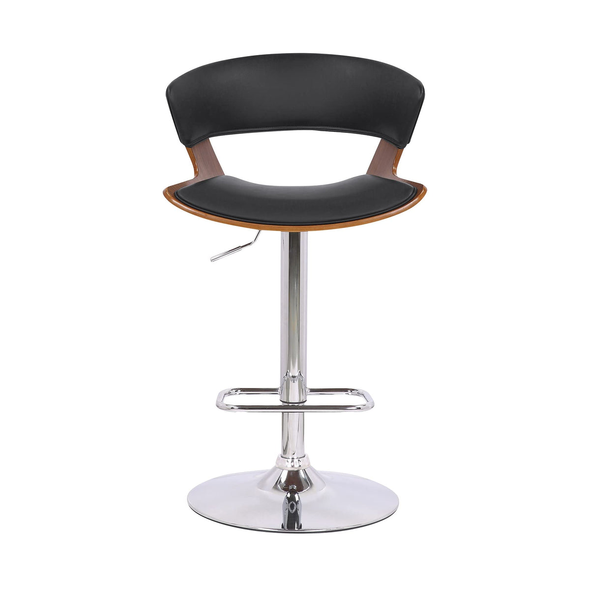 Balancing trend and functionality in the best way, this Black Faux Leather Adjustable Swivel Wooden Bar Stool brings the quintessential look to complete your modern interior style. Designed with an antiquated look with a touch of retro, the stool is a casual addition to the room that adds depth. The chair swivels 360-degrees to give you mobility and comfort. Constructed with wood, metal and a faux leather upholstery, this stool is fit to stand the test of time. The matte black padded seat in faux leather with brown wooden accents is paired with a shiny chrome base for a visually sleek and modern appeal. The height is adjustable with a level that takes it between 35 and 43 inches of height and the padded cushions ease you in every time you sit on it. Elevate your home with the textures and fresh style of this mixed material bar stool and watch it add character to the room. 43†x 21†x 20â€