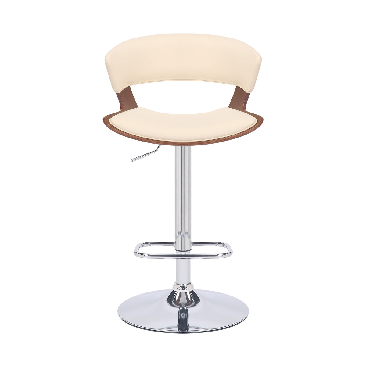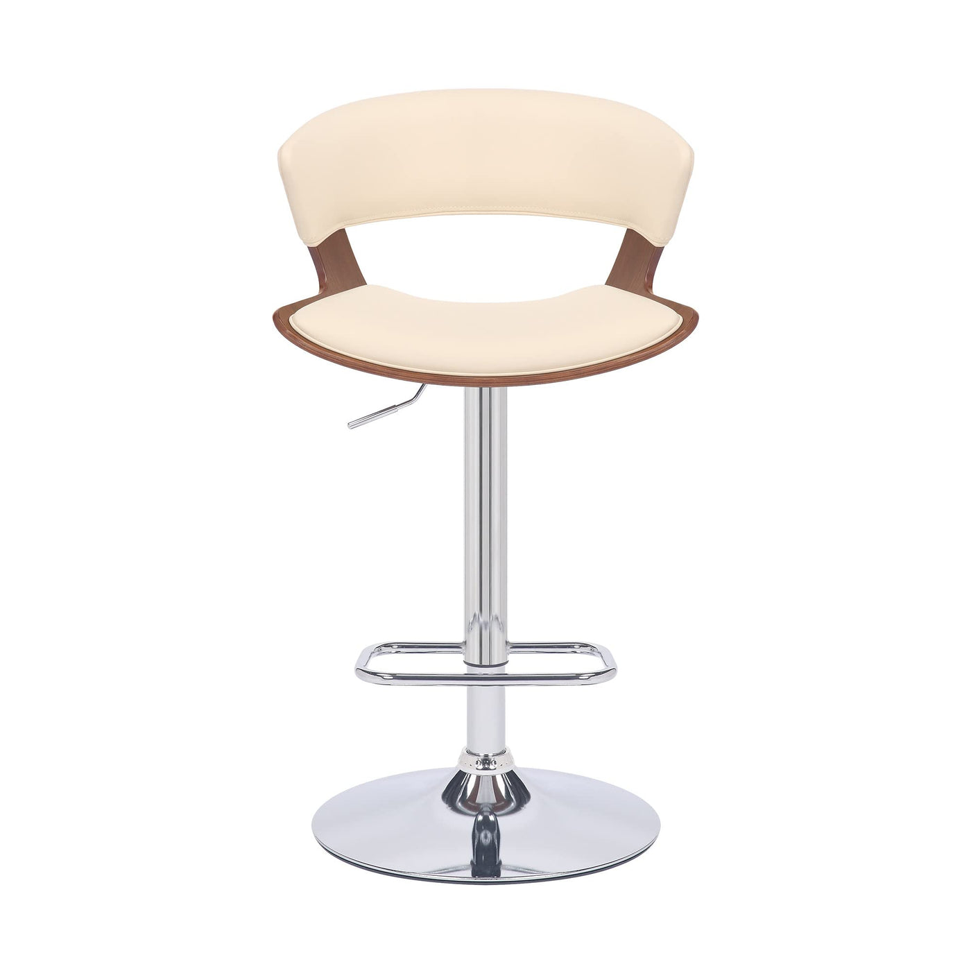 Balancing trend and functionality in the best way, this Cream Faux Leather Adjustable Swivel Wooden Bar Stool brings the quintessential look to complete your modern interior style. Designed with an antiquated look with a touch of retro, the stool is a casual addition to the room that adds depth. The chair swivels 360-degrees to give you mobility and comfort. Constructed with wood, metal and a faux leather upholstery, this stool is fit to stand the test of time. The matte cream-toned padded seat in faux leather with brown wooden accents is beautifully paired with a shiny chrome base for a blend of trend and tradition. The height is adjustable with a level that takes it between 35 and 43 inches of height and the padded cushions ease you in every time you sit on it. Elevate your home with the textures and fresh style of this mixed material bar stool and watch it add character to the room. 43†x 21†x 20â€