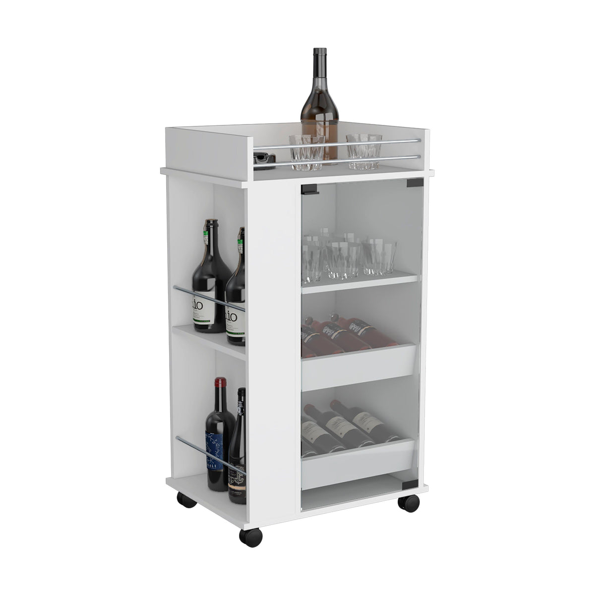 Lansing Bar Cart With Glass Door, 2-Side Shelves And Casters, White