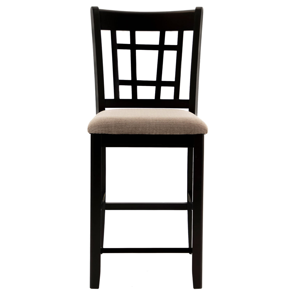 Lavon Collection counter height chair ideally suited for pairing with the Lavon modern dining table (not included). Seat is upholstered in soft tan fabric and cushioned for coziness. Legs and back finished in light chestnut and espresso. Seat back features catchy rectangular lattice design. Conveniently placed footrest means you're always ready for the next course or the next conversation.