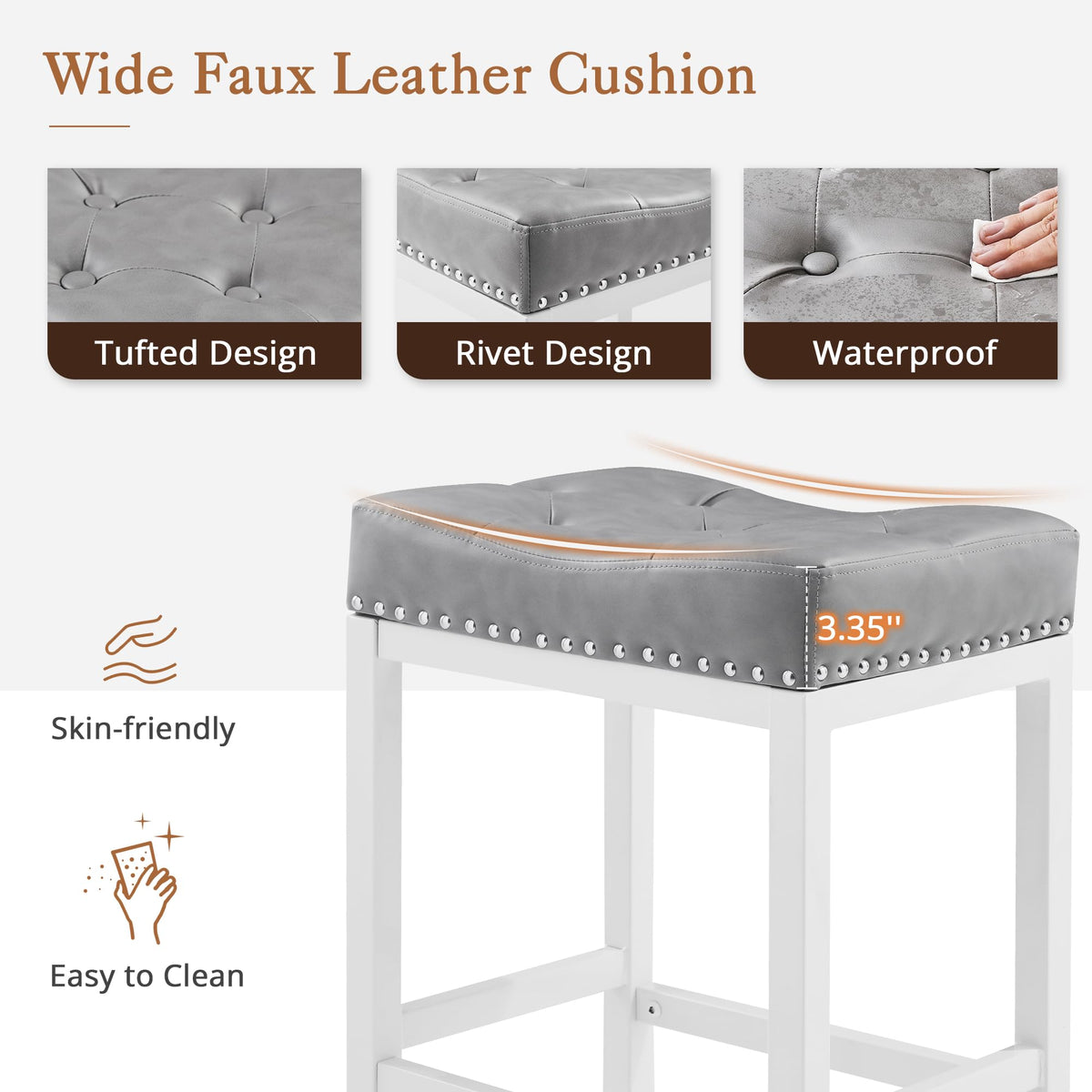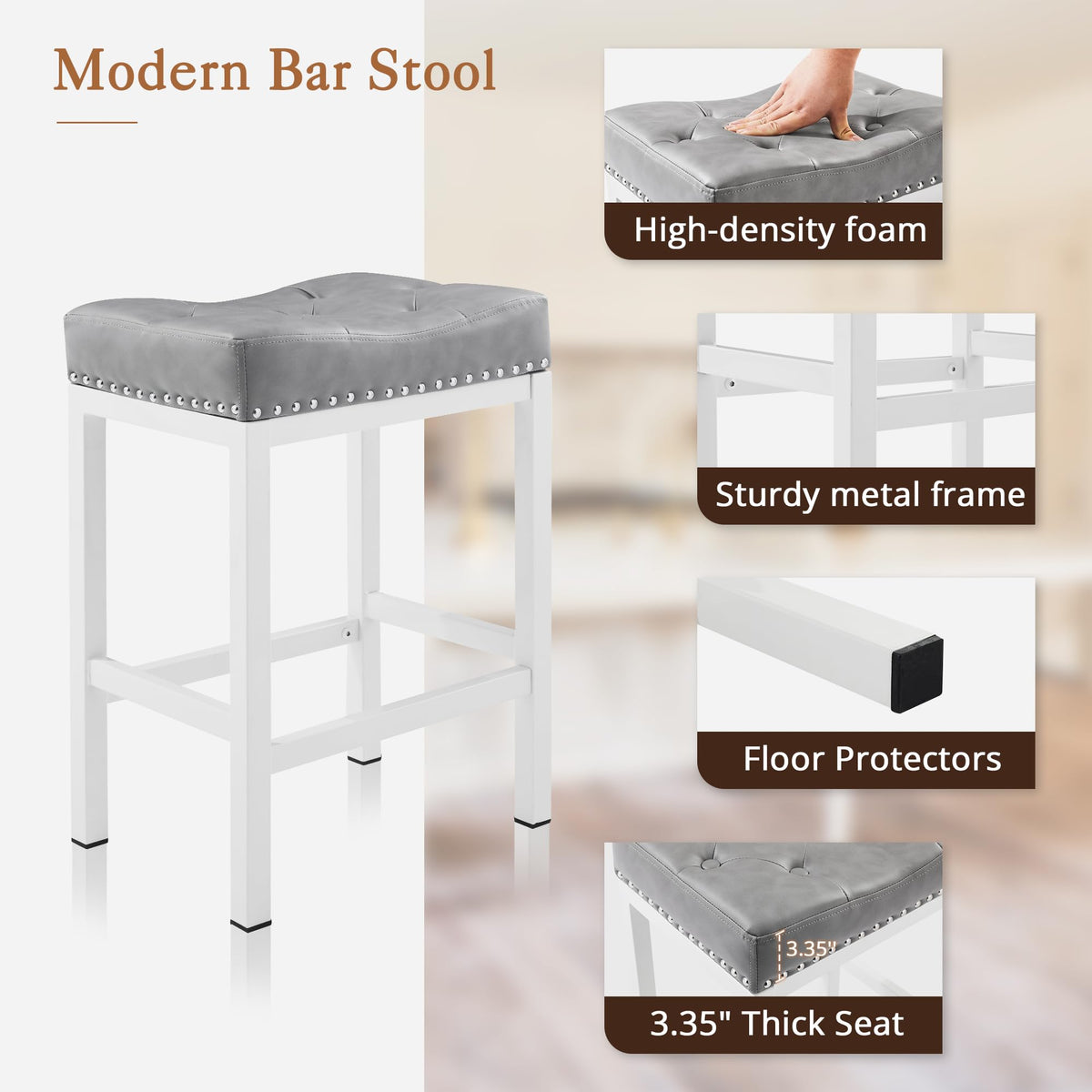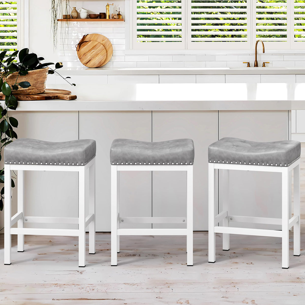 Lue Bona Counter Height Bar Stools, 24 Inch Saddle Backless Bar Stools Set Of 3 For Kitchen Counter, Faux Leather Counter Stools With White Metal Legs, Modern Kitchen Island Stools, Light Gray