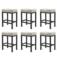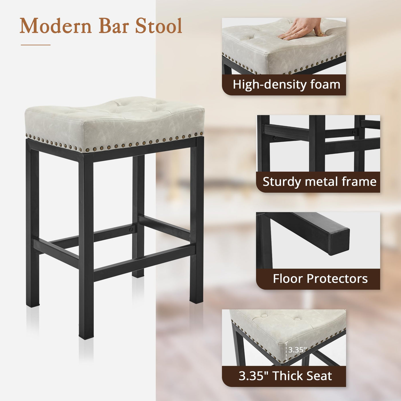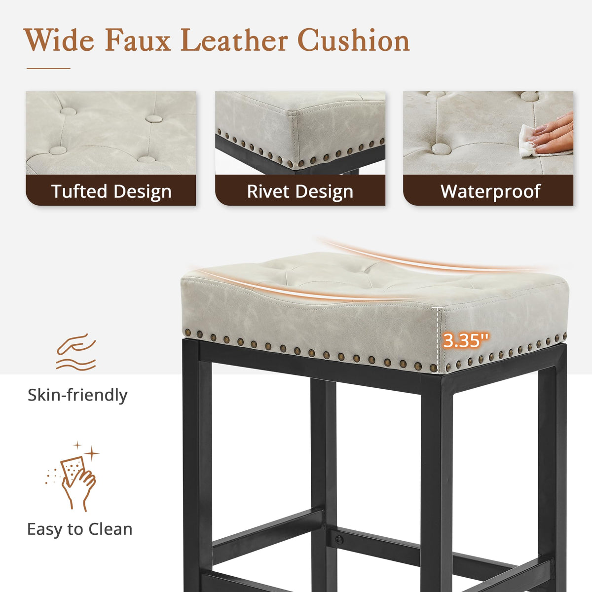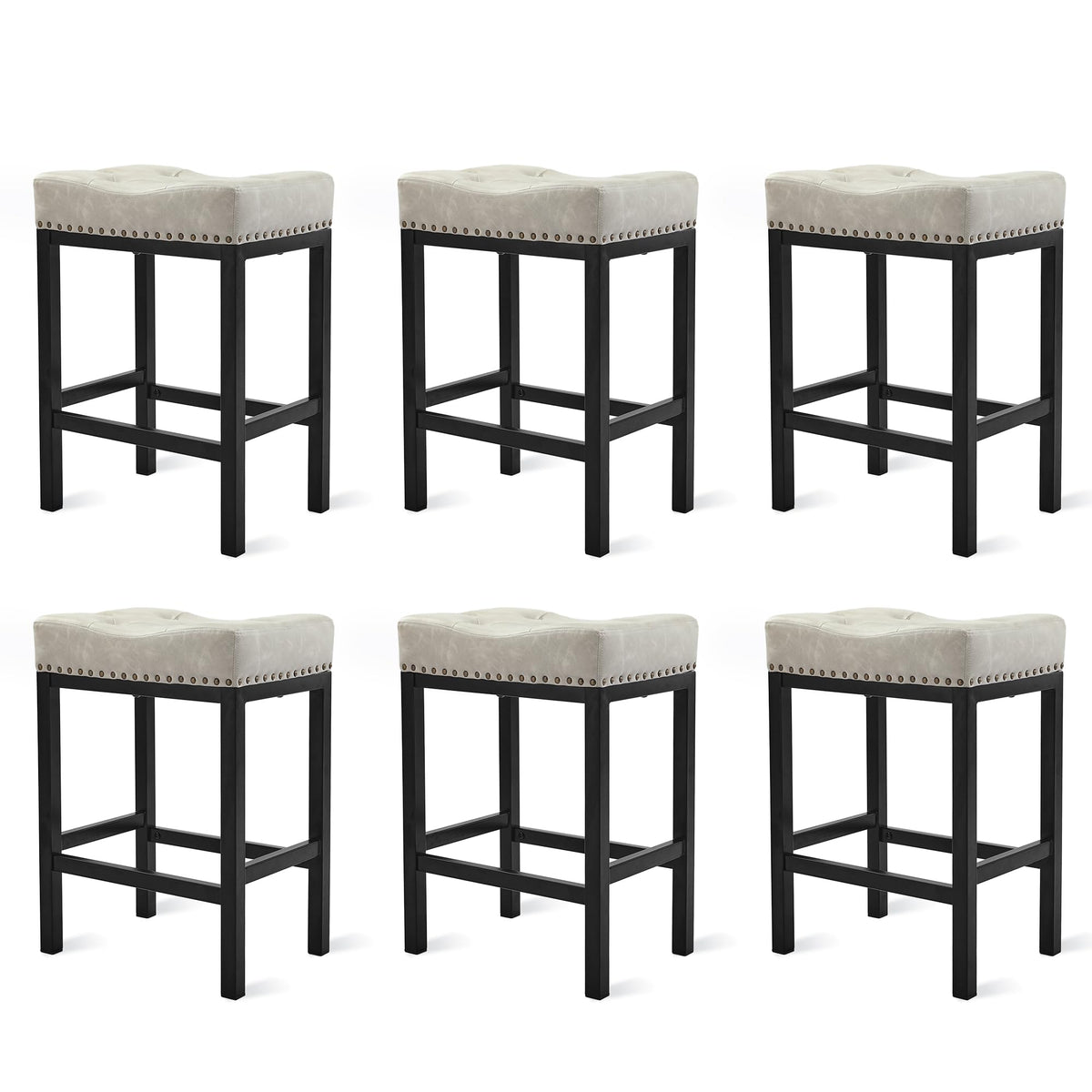Lue Bona Counter Height Bar Stools, 24 Inch Saddle Backless Bar Stools Set Of 6 For Kitchen Counter, Faux Leather Counter Stools With Black Metal Legs, Modern Kitchen Island Stools, Light Beige Gray