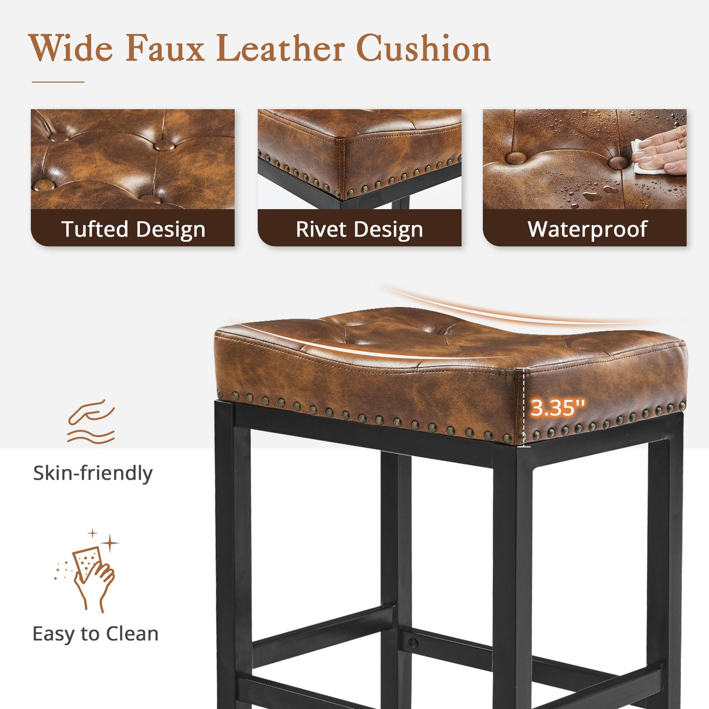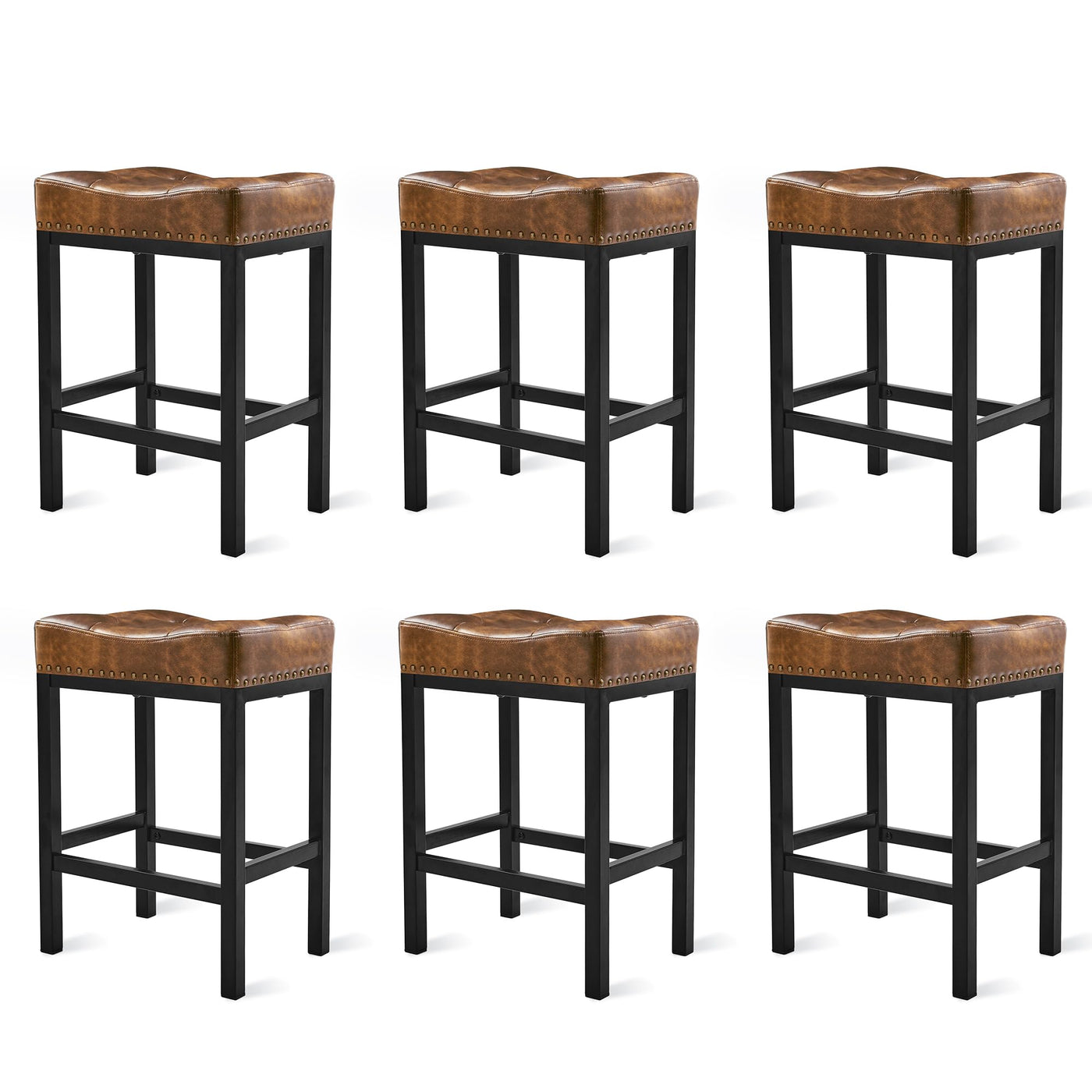Lue Bona Counter Height Bar Stools, 24 Inch Saddle Backless Bar Stools Set Of 6 For Kitchen Counter, Faux Leather Counter Stools With Black Metal Legs, Modern Kitchen Island Stools, Yellowish Brown