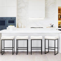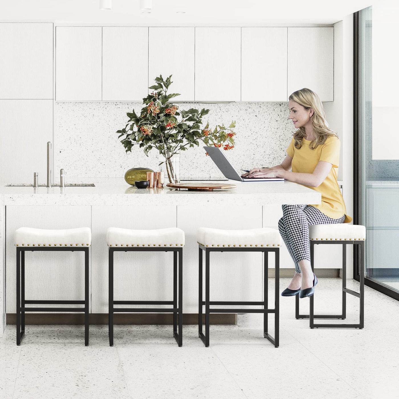 Lue Bona Counter Height Bar Stools, 24' Square Saddle Barstools Set Of 3, Modern Backless Faux Leather Counter Stool With Black Metal Legs For Kitchen Island Counter, Home Bar, Bistro, White