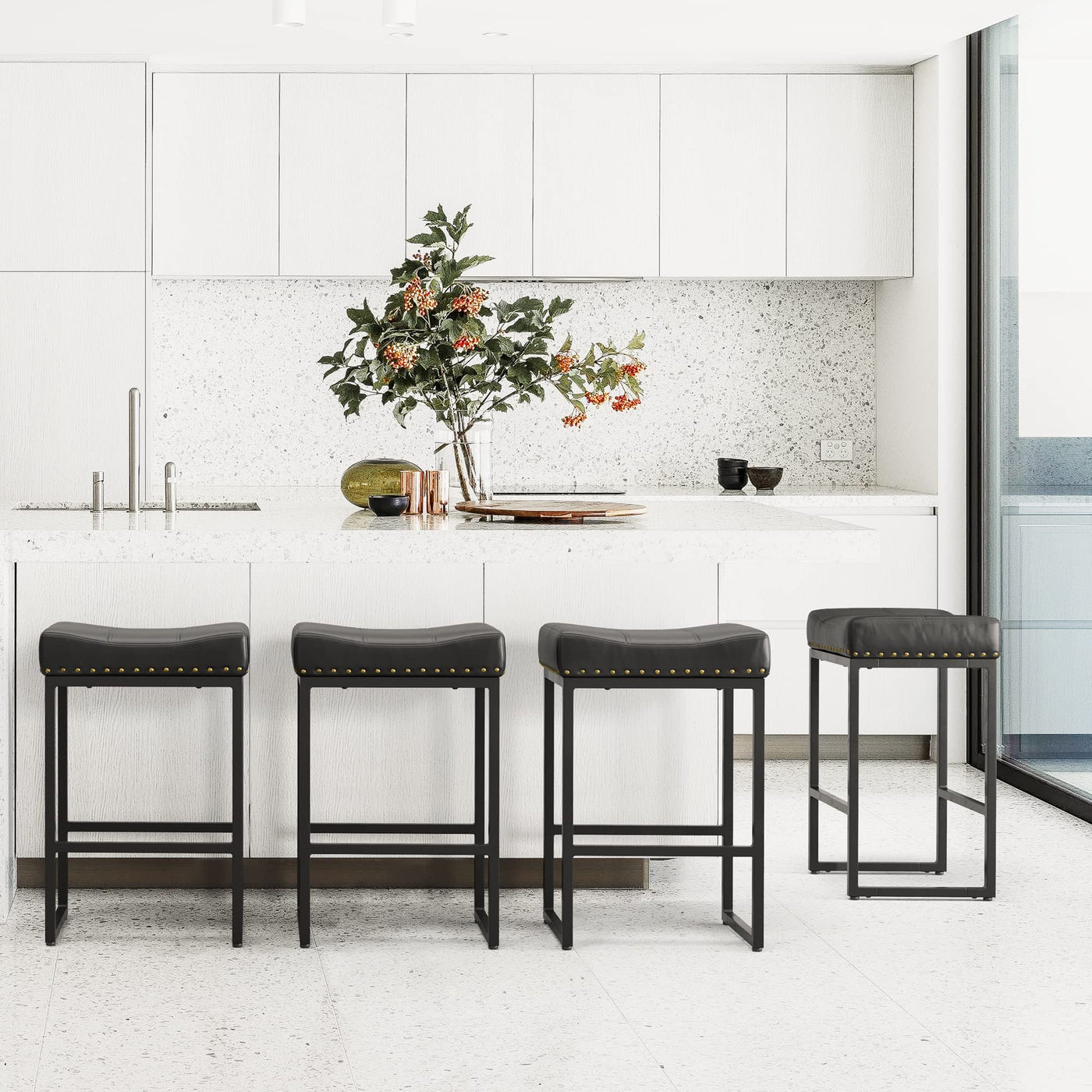 Ergonomic Counter Bar Stools Lue Bona 24' Square Saddle Barstools Set Of 4, Modern Backless Faux Leather Counter Stool With Black Metal Legs For Kitchen Island Counter,Home Bar,Bistro,Black
