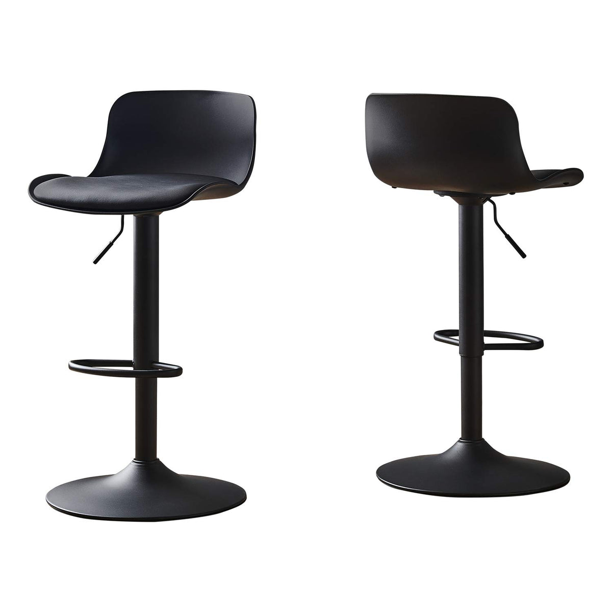 Boost the look of your casual dining and entertainment area with this set of 2 modern, armless barstools in a sophisticated black finish. The simple, low curved shell back, with a wide cushioned black leather-look seat that swivels 360 degrees, makes it easy for guests when conversing, and it includes a built-in footrest for added comfort and style. The hydraulic lift lever under the seat smoothly adjusts the seat from counter to bar height for added versatility, with a strong black metal pedestal base keeping the barstool stable. Easy to assemble, get ready to seat your guests for drinks or a meal in these chic bar stools!