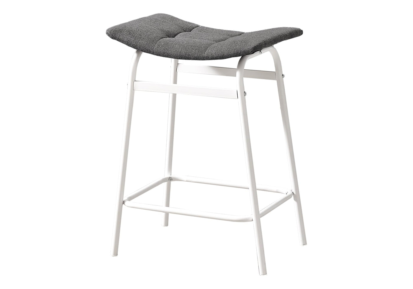 SET OF 2 COUNTER HEIGHT BARSTOOLS: This set of 2 counter height barstools standing at 25 H, upholstered in a durable grey fabric brings a chic, fashionable style to your kitchen or bar area. | STURDY CONSTRUCTION: The sturdy white metal legs with a built-in footrest offers comfortable and durable seating for everyday dining or entertaining. | PADDED CUSHIONING: The thick backless padded saddle seats with foam cushioning provides extra support with maximum comfort. | EASY TO ASSEMBLE: The illustrated, step by step instructions makes this an easy to assemble, ready to add a fresh, modern element to your dining and entertainment area. | 2 YEAR LIMITED WARRANTY: These contemporary barstools come with a 2 year limited warranty against any manufacturer defects for your convenience; weight capacity: 200 lbs per stool