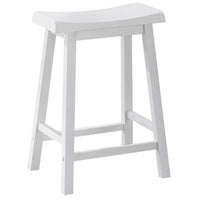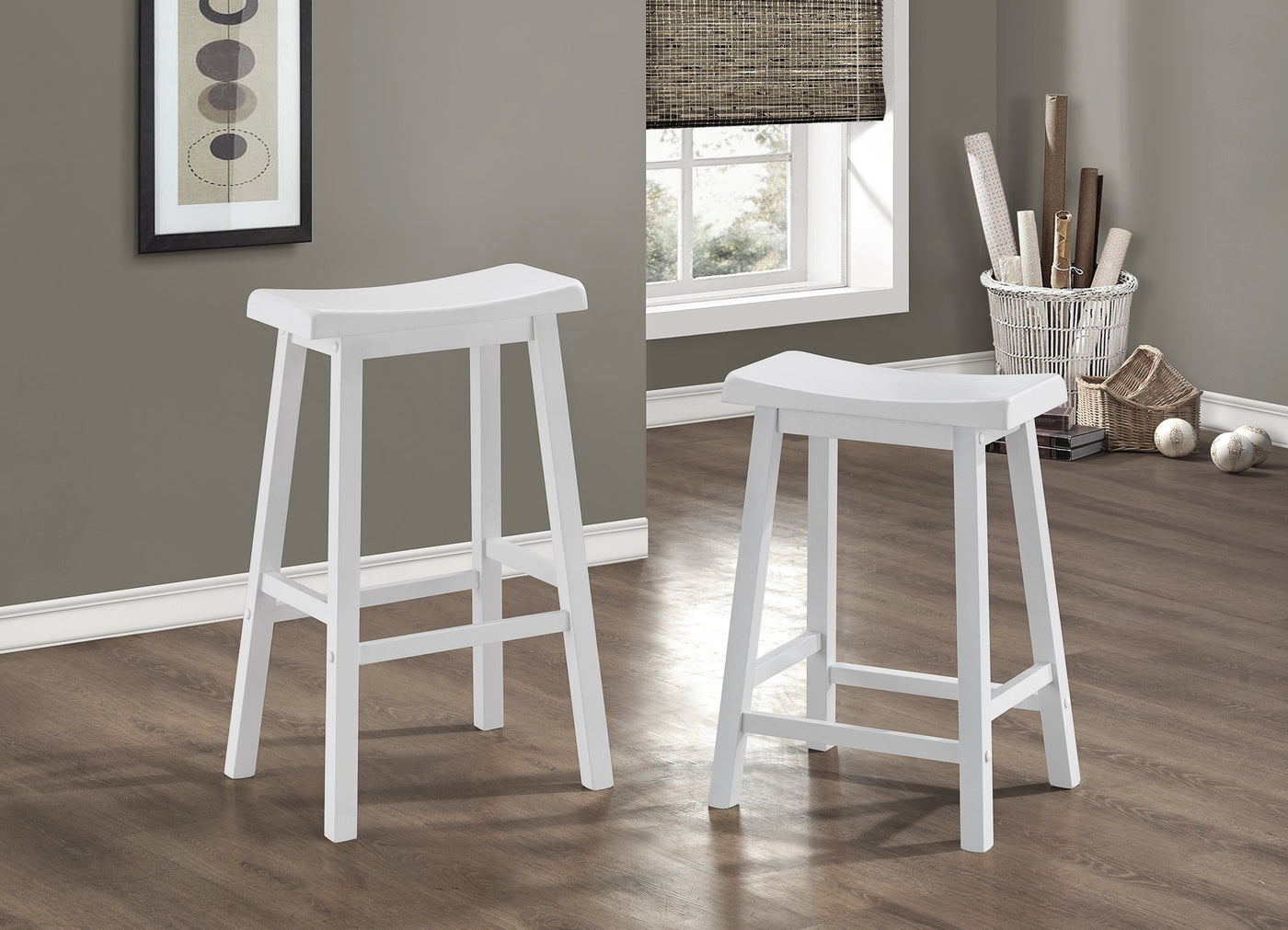 This set of two 24' high barstools in a white finish is a perfect addition for kitchens, game room or for extra seating when company arrives. With a comfortable saddle seat and well positioned footrest, these classic counter height stools will be the staple of many memorable evenings with friends and family.