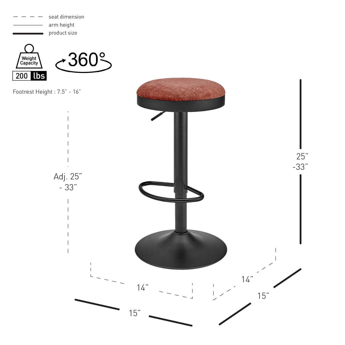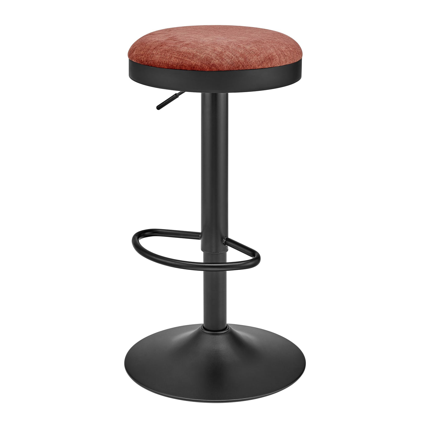 Experience comfortable and stylish seating for you and your guests with a Modern Industrial-style barstool, offering adjustable height from 25" to 33". Topped with rich coral tone velvet fabric, it includes a convenient footrest surrounding the pedestal steel base. The seat provides a 360-degree swivel and pneumatic height adjustment via a small lever. Some assembly is required. Available in sets of two and in a variety of colors.