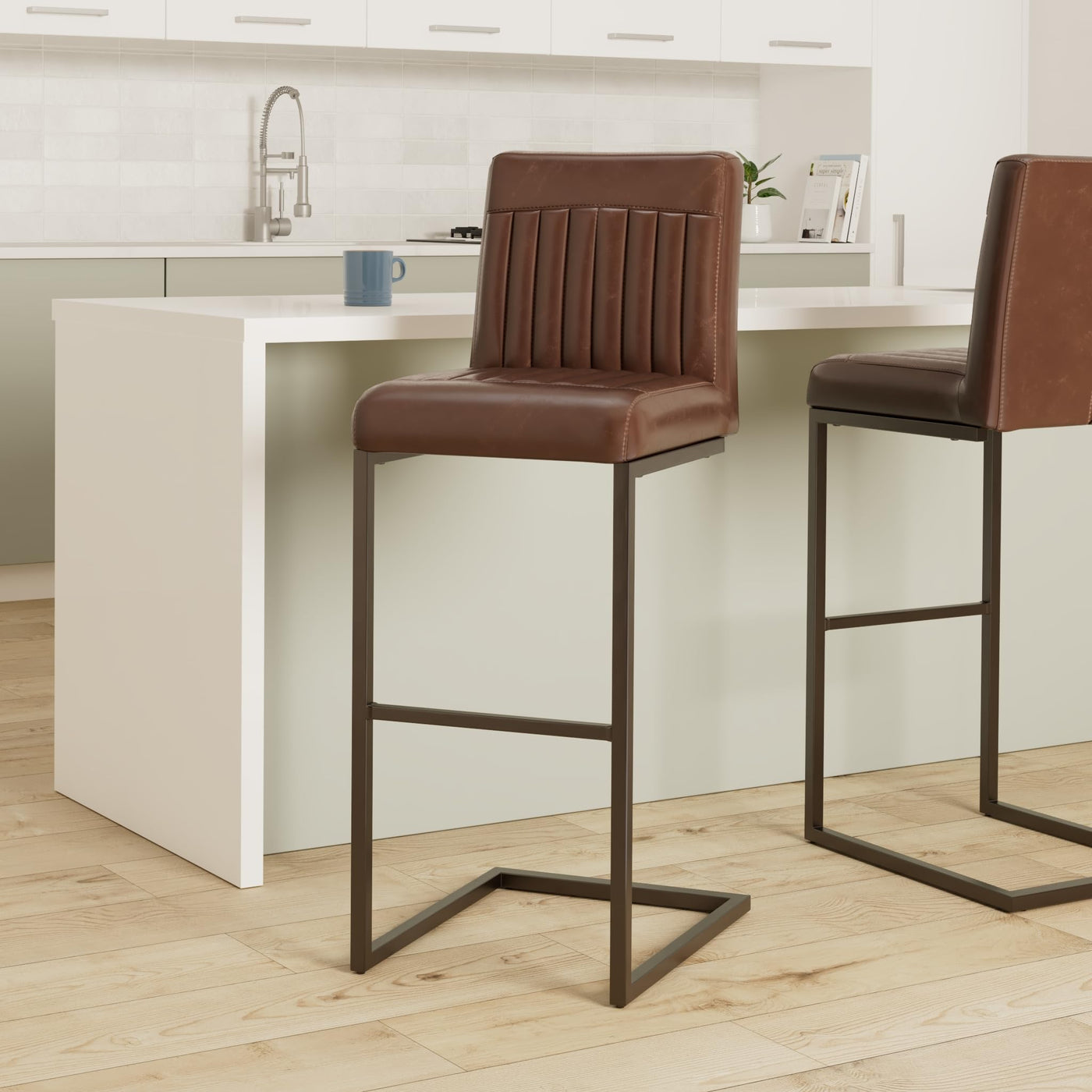 The Ronan Barstool Strikes A Vintage, Industrial Pose And Offers A Profile That Looks Great Viewed From Any Angle. A Sturdy Performer In A Variety Of Settings, The Cantilevered Iron Frame Sports A Rubbed Gray Finish Paired With Channel-Tufted Antique Cigar Brown Leather-Like Fabric On The Back And Sides.