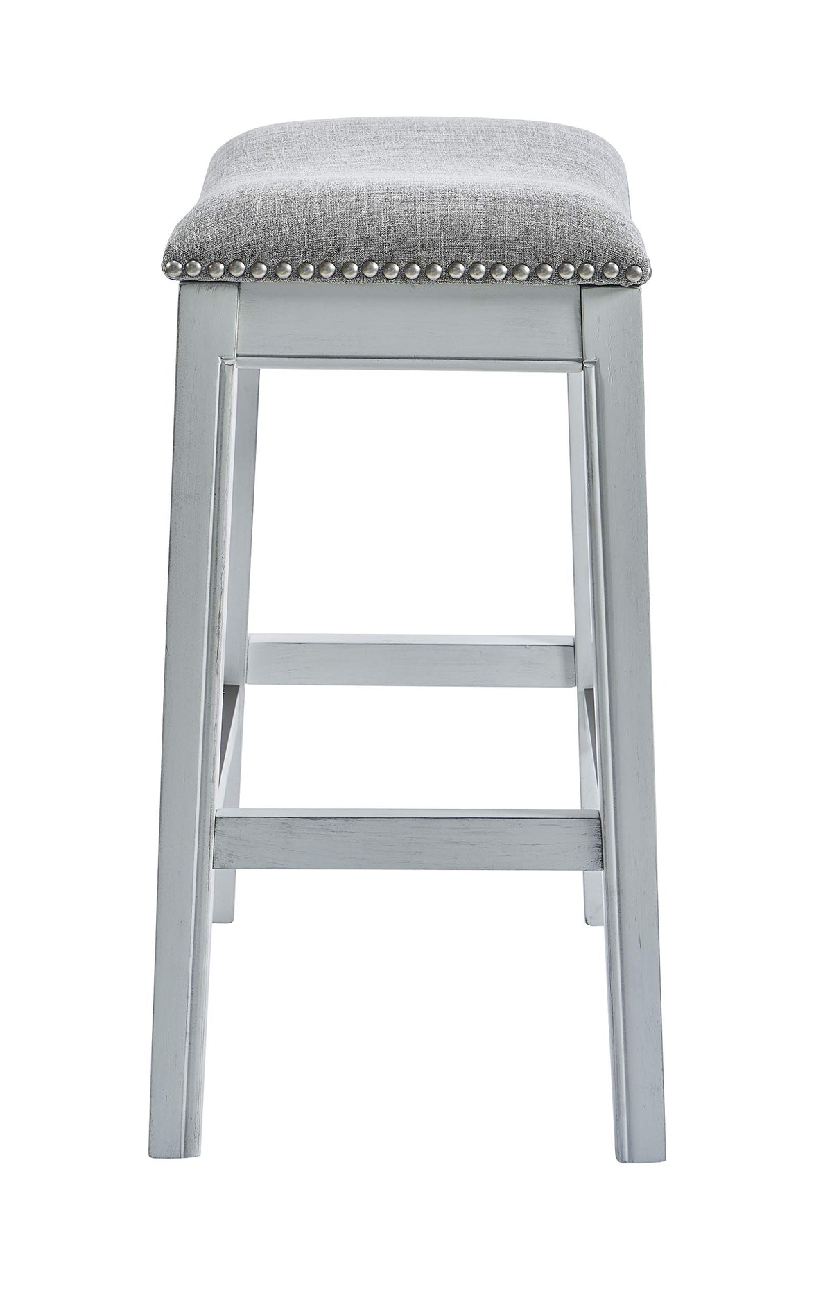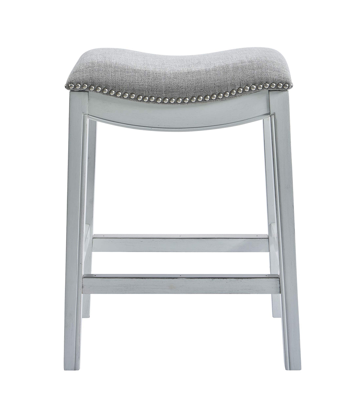 Zoey Bar Stool has a comfortable upholstered seat with hand-applied antique nail head accents. The subtly contoured saddle seat sits atop a beautifully finished solid wood frame. This is a counter-height stool at 26 inches. With its neutral white frame and gray fabric seat, it will fit in any decor; from kitchen to recreation room. Assembly tips- Do not tighten screws completely until final step of assembly. Allow glue 8 hours to dry before using stool.
