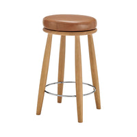 In true Modernist fashion, the Deandre counterstool features a swivel seat with a rounded design and tapered wooden legs in a harmonious Danish Modern style. The legs showcase a natural tone, complemented by a round metal footrest for added comfort. The backless seat is upholstered in soft faux leather. Fully assembled. Available in Borneo Chocolate PU and Palladian Beige fabric.