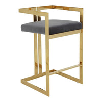 Bar stool with clean lines, simply make this a must have for the modern enthusiast! Seat height is approx. 27.5"; Seat depth is approx. 18"; Arm height is approx. 32"; foam density is 2 PCF (high density foam); No assembly required.Features:Material: Stainless steel, velvetFinish: Gray, goldStyle: Glam, modernNo assembly requiredSpecifications:Product Dimensions: 35"H x 18"W x 18.5"DProduct Weight: 29 lbsWeight Capacity: 300 lbs