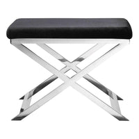 Modern stool with sleek high polished X-shaped steel legs.Faux Leather Black ideal for any room, living, or bedroom; seat height is 20"Features:Contemporary StoolModern StoolUpholestered StoolPolished Steel LegsMinimalistBlack StoolSpecifications:Seat Height: 20"