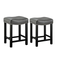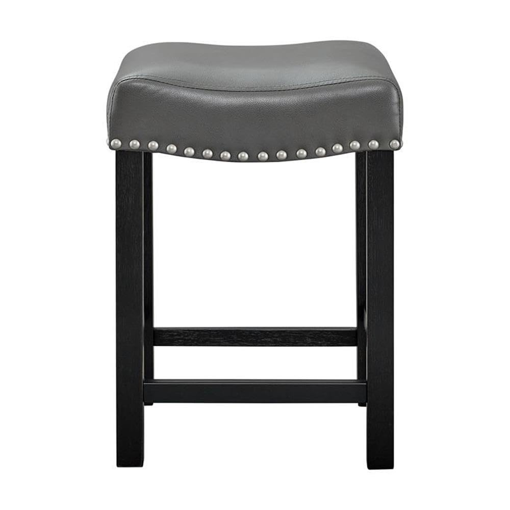 The Aspen Counter Stool is the prime choice for comfortable seating. The comfy contoured saddle seat, in gray faux leather, is easy to clean and contrasts nicely with the ebony wood finish of the solid wood frame. Features include silver nail head accents, adjustable leg levelers and a comfortable foot rail for added stability. Your purchase includes two counter height stools. Features Solid wood frame