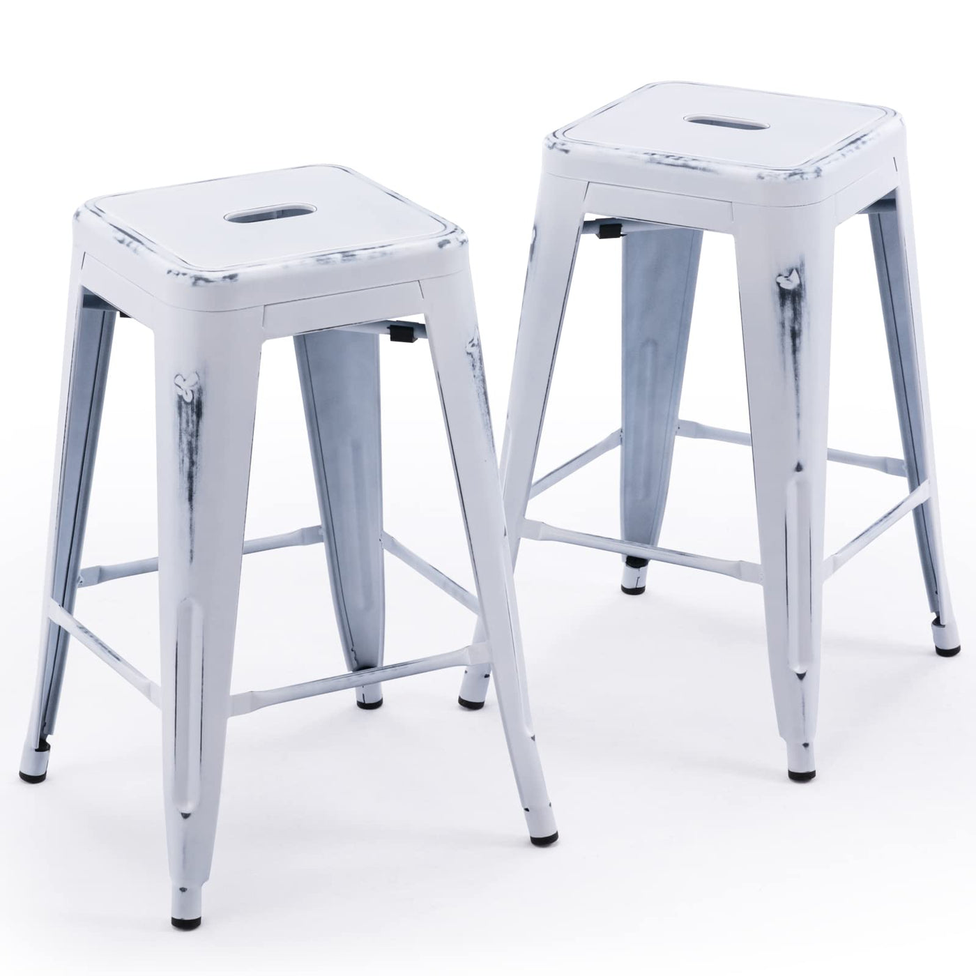 Vogue Furniture Direct 24 Inch Metal Bar Stools, Backless Counter Height Barstools, Indoor Outdoor Stackable Stools With Square Seat, Set Of 2 (Distressed White)