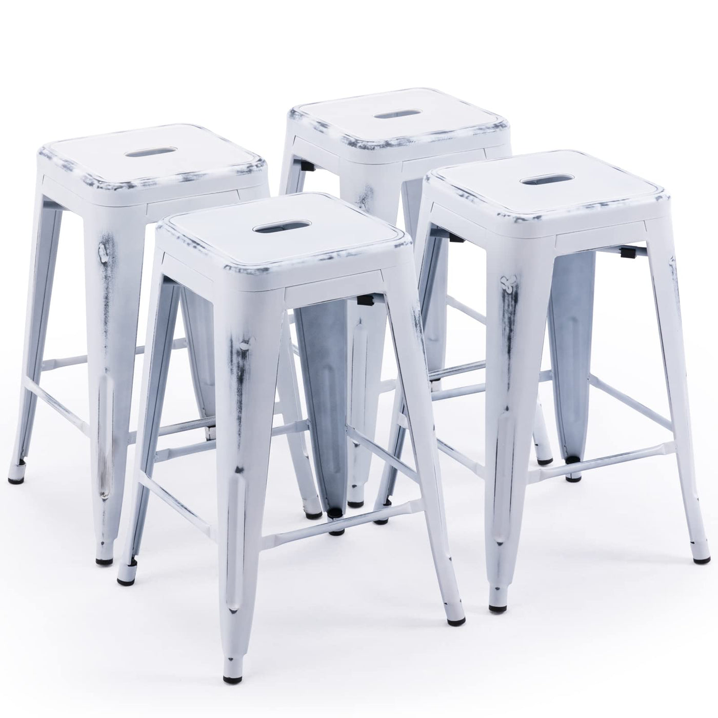 Vogue Furniture Direct 24 Inch Metal Bar Stools, Backless Counter Height Barstools, Indoor Outdoor Stackable Stools With Square Seat, Set Of 4 (Distressed White)
