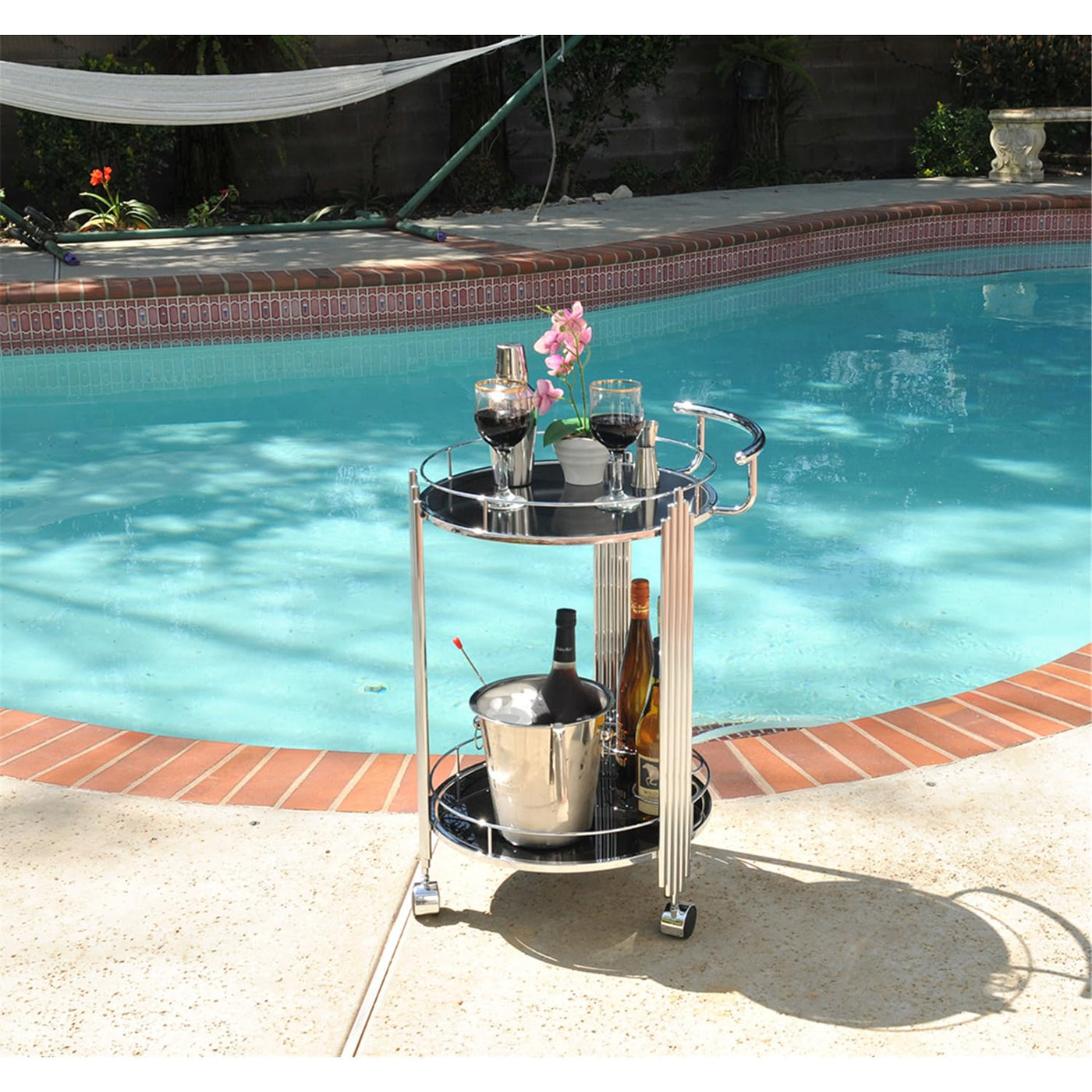 Details : This made in Taiwan Anne Home 2-Tier Round Serving Trolley features two opaque tempered glass and a full durable chrome frame. It has built-in guard rails to keep your items secure, three wheels that rotate a full 360 degree and three rings in the lower tier that act as a bottle holder. The trolley is perfect for a party or for displaying a variety of beverages and wine accessories. The design is timeless, compact, and versatile. It can fit anywhere in your home or be used as a solo accent piece. Assembly is required. Note: Wine glasses and all other accessories are not included.Ingredients - Chrome, GlassColor - ChromeCountry of Origin - ChinaWarranty : 30 Day Warranty