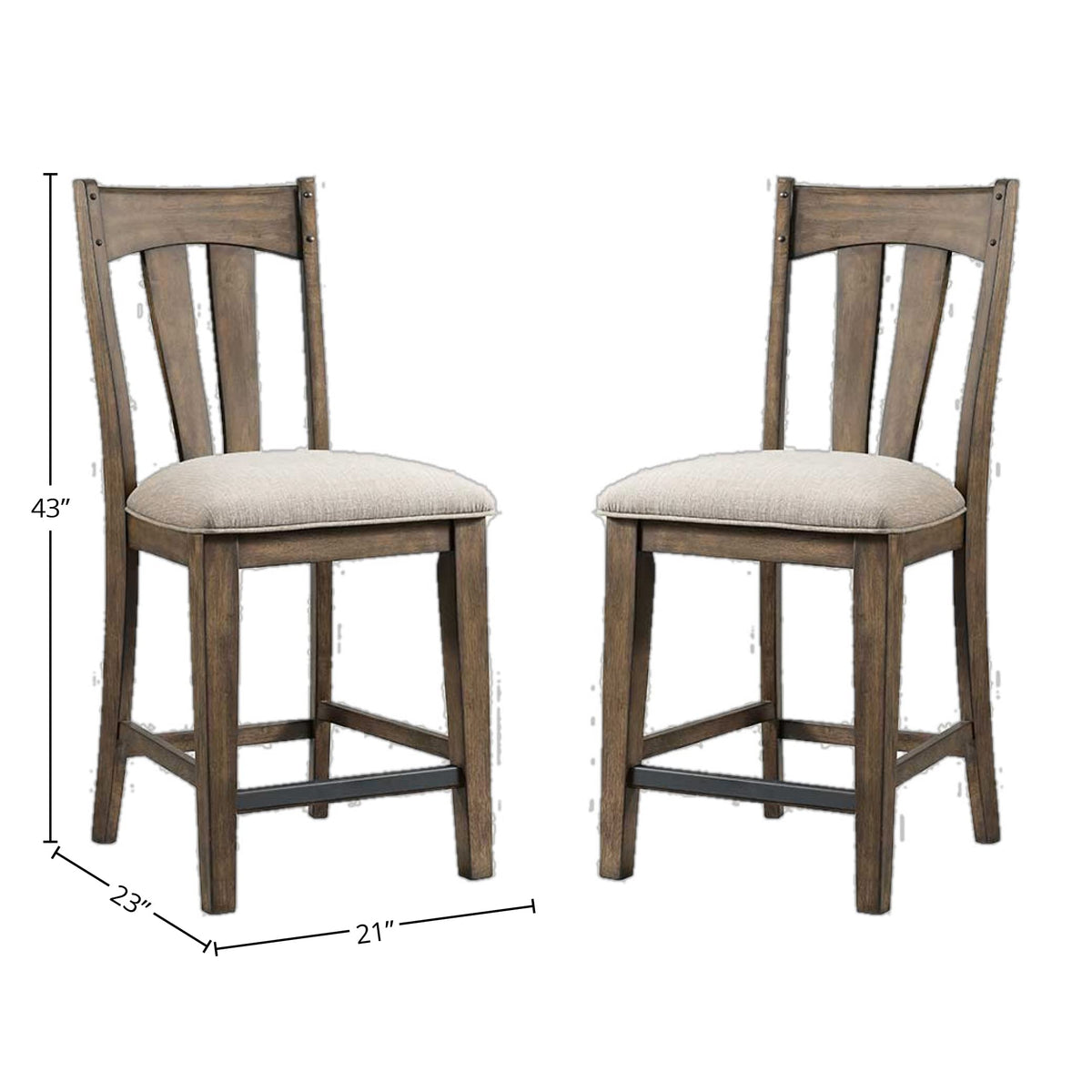 The Whiskey River Splat Back Counter Stool with Cushion Seat is the perfect addition to your bar or kitchen area. Made from slightly distressed wood, these barstools have a rugged, natural look that will add a touch of rural charm to your space. With a comfortable upholstered seat and a gunpowder grey finish, these stools are both stylish and functional. The slat back design provides a supportive backrest, making them perfect for sitting and enjoying a meal or drink.FeaturesFeatures comfortable cushioned seats Charming square style seat adds rustic flair to any space Upholstered seat barstool with web seating provides maximum comfort Gun powder gray finish is suitable for all decor styles Complement your space with additional pieces from our Whiskey River collection (sold separately) Comes in a set of 2 counter-height stools for your convenienceDimensionsAssembled Product: 21 inches wide x 23 inches deep x 43 inches high Seat Height: 24 inches Weight Capacity: 300 poundsIntercon was established in 1976 and has become an industry leader in designing, marketing and manufacturing wood dining, bedroom and home entertainment furniture. It has been a family owned and operated business for over forty years. Our design and warehouse capabilities allow us to be a leading provider of furniture throughout the United States and Canada. It is our mission to offer our customers superior quality products with lasting value.