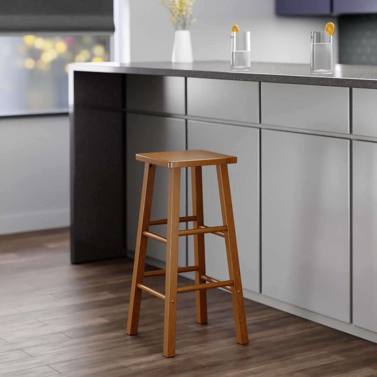 Winsome Wood's Carrick Bar Stool with square seat offers a refreshingly different take on the fundamental bar stool. Made of solid wood in a lovely teak finish, the 1" thick seat is just over 12" square, giving you plenty of room at the bar or a bar height table for snacks, a drink with friends, or working on your laptop. Four sets of crossbars make for a sturdy and balanced stool and provide footrests at two different heights. Along with the smooth, rounded edges of the seat, the warmth of the wood grain will set a comfortable and welcoming tone in your den, dining area, or media room. The bar height seat is 29"H and like most Winsome stools is also available in a counter height. The stool is shipped in a single box that includes the hardware necessary for assembly. Replacement part request can be submitted directly to the manufacturer within 60 days from date of purchase. Overall dimensions: 29"H Seat dimensions: 12.04"W x 12.04"D x (.98" thick) Distance from ground to lowest cross bars: 11.4"H Distance from ground to perpendicular cross bars just above: 13"H Leg footprint: 14.33" square Assembly required Ships in 1 box