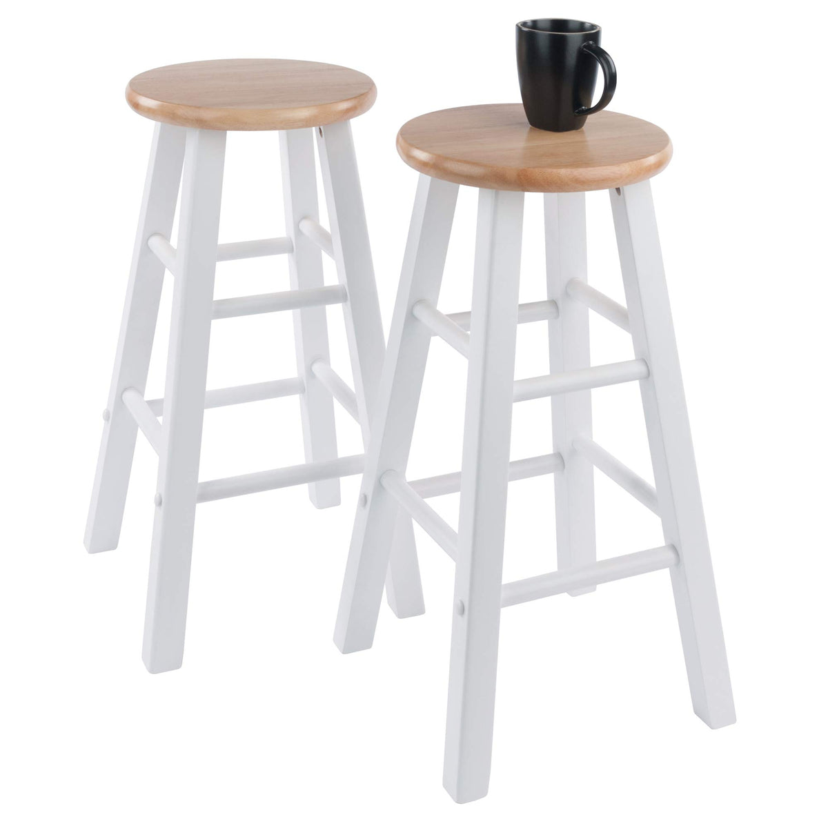 Spruce up your kitchen, breakfast nook, or den with this Winsome Element Counter Stool Set. The crisp combination of a natural-finished seat and white base, giving these classic stools a blend of modern and traditional design. They feature a more conservative foot print than many other flared-leg stools which give them a streamlined, contemporary look and allow them to be tucked neatly underneath a counter or table. At nearly 24" high these stools have a static weight of 220lbs. Crafted of solid wood, these stools have both high and low crossbars on all sides which provides stability while also serving as convenient footrests. The round seat is 12" in diameter, offering a generous seating area. The 2-piece set conveniently ships in one box that includes the hardware needed for assembly. Replacement part request can be submitted directly to the manufacturer within 60 days from date of purchase. Overall size: 13.3" x 13.3" x 24"H Weight capacity 220 lbs. Ships in 1 box Some assembly required
